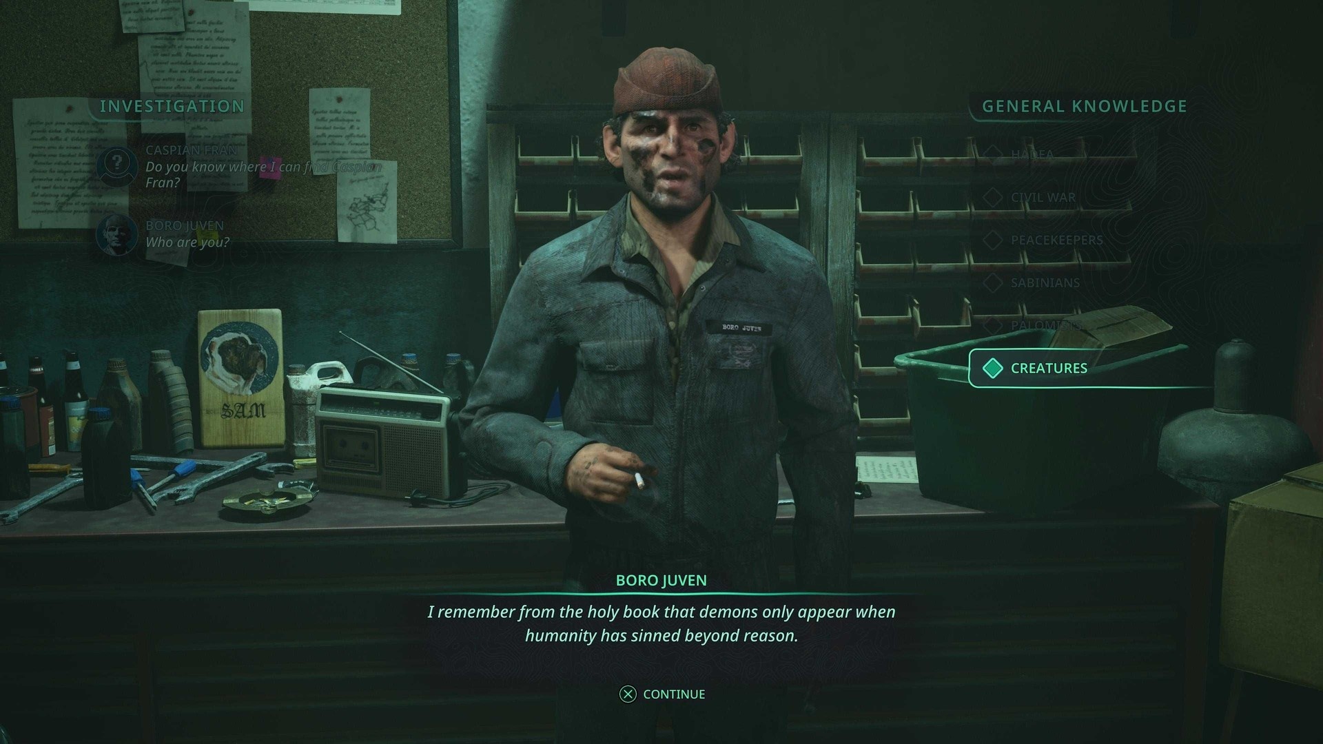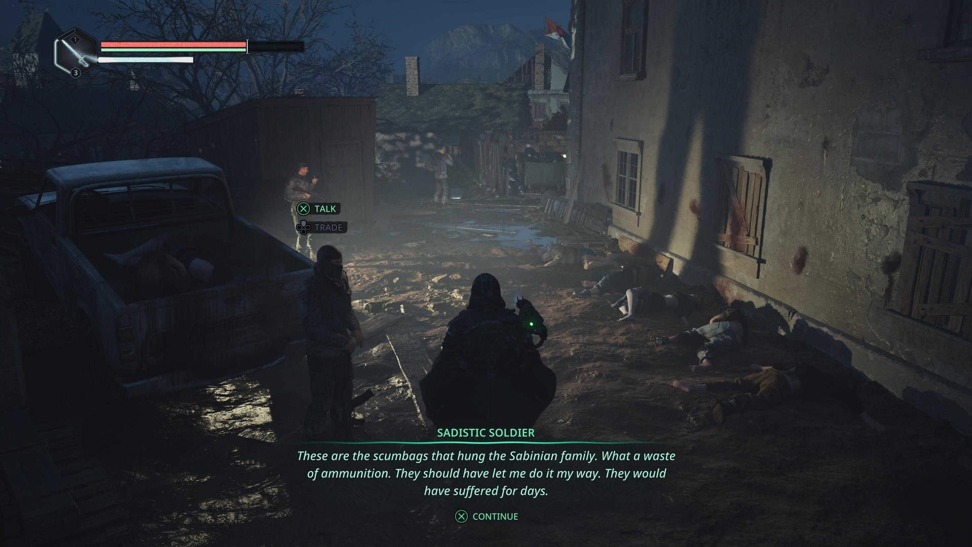Hadea is a country scarred by civil war between two religious factions, the Sabinians and the Palomists. The game presents both sides committing atrocities, and most locations—such as a government research center and a national library—are strewn with corpses. Lore is delivered through documents and collectibles, and the game does not fully explain why the pale demons appeared; instead, it leaves clues for players to piece together.