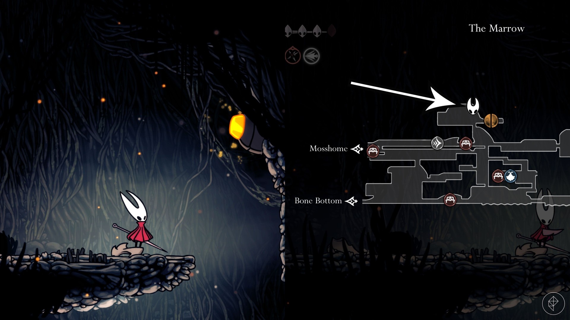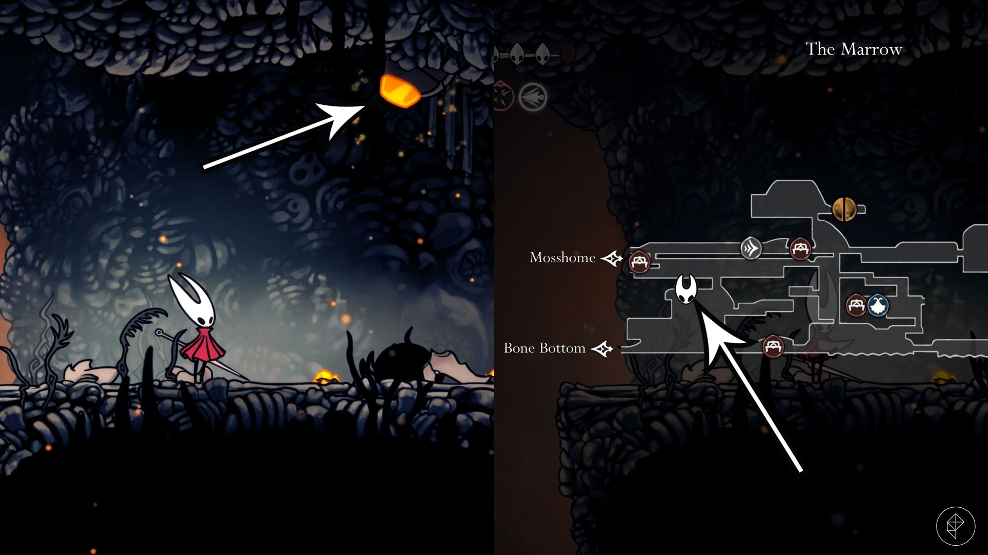 Once the notice is on the board, travel to The Marrow to begin. Note that one of the beetle spawns requires reliable downward aerial attacks (pogoing), so if you struggle with the basic downward strike, consider using the Reaper Crest from the Chapel of the Reaper in Greymoor or the Wanderer Crest found in Bonegrave to help reach higher platforms.