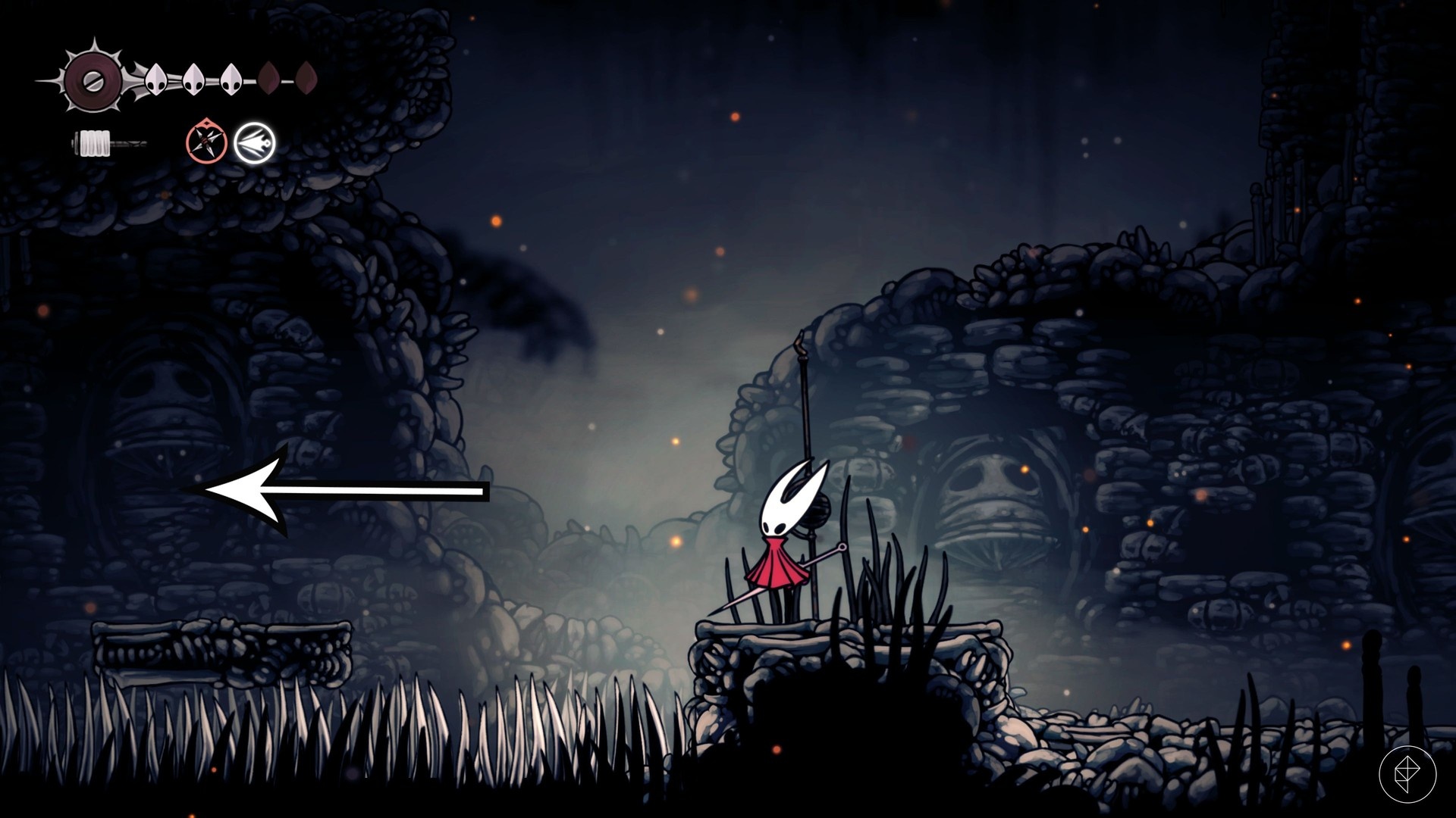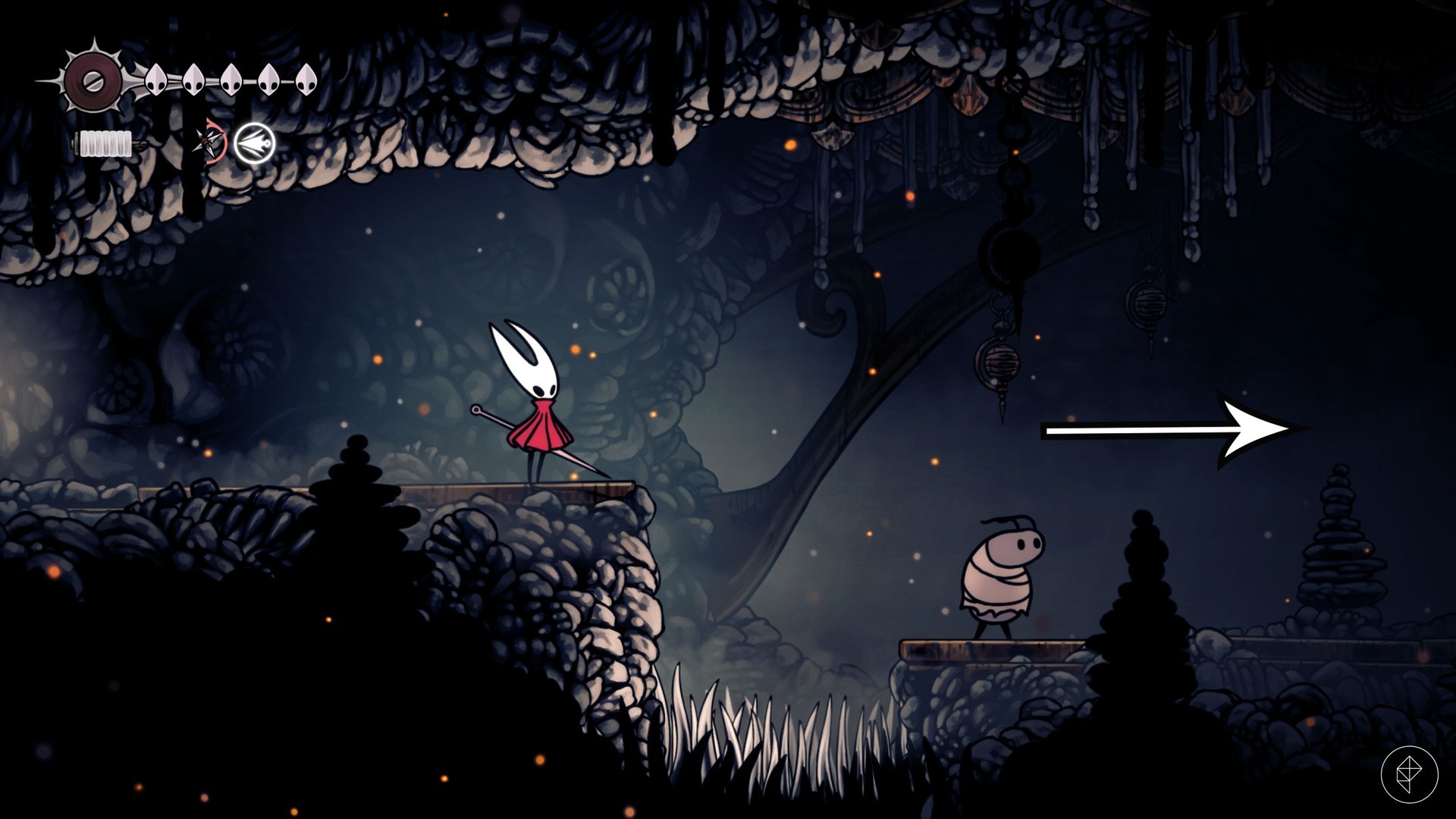 Continue up and right until you reach a fork. Drop down either branch and you’ll find the third Volatile Flintbeetle on the left at ground level. After defeating it, collect the Flintgem and return to Bone Bottom.