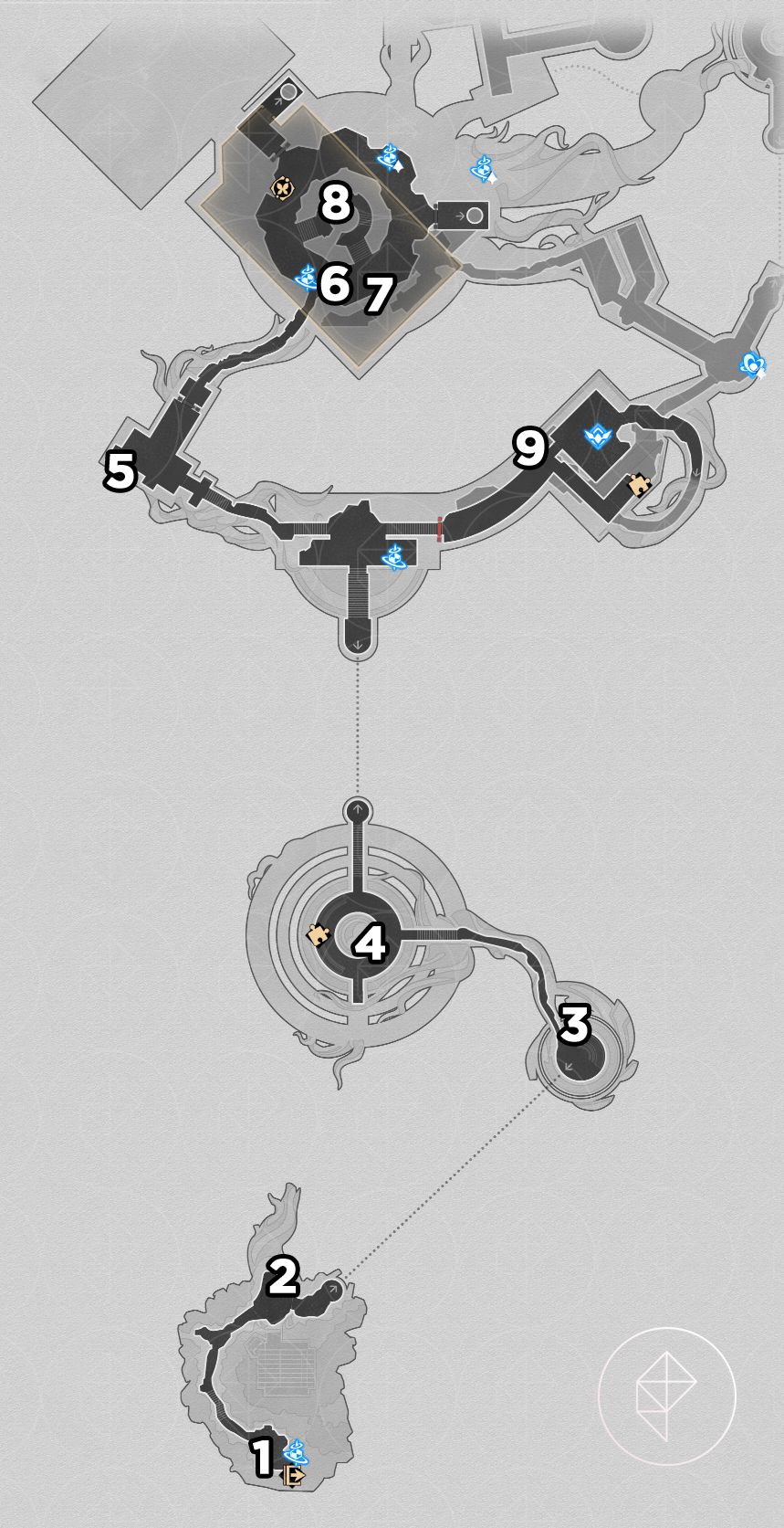 This map mixes manual and auto-collection (auto-collect applies to matches from the Fortress of Dome variant). The Gentle Garmentmaker’s hint points to a compass puzzle on F2; solving it yields a special chest and the “Chirping Secret: Rainbow’s End” achievement. Video demonstration below.