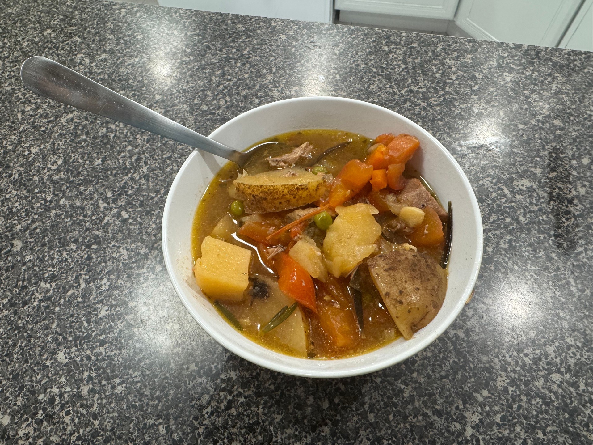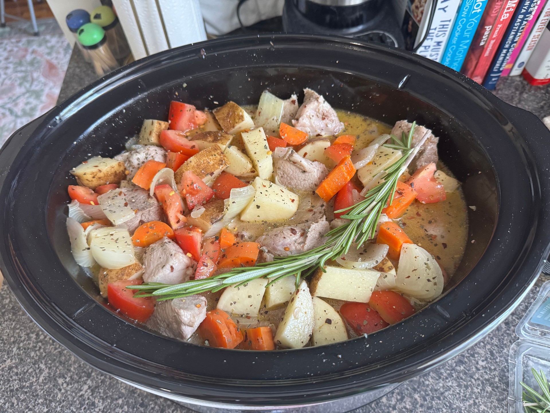 To test the recipe, the cook used three pounds of pork shoulder and followed the note’s broad steps: brown the meat, cook the vegetables, add liquid, and let it simmer for hours. The finished dish included peas and fresh rosemary, and the cook used a slow cooker to maintain a low temperature for the five-hour period. The recipe calls for a “generous pouring” of red wine, which the cook used to add depth to the broth. The article’s author also noted that buying commercial “bone broth” increased the cost, rather than making stock from bones.