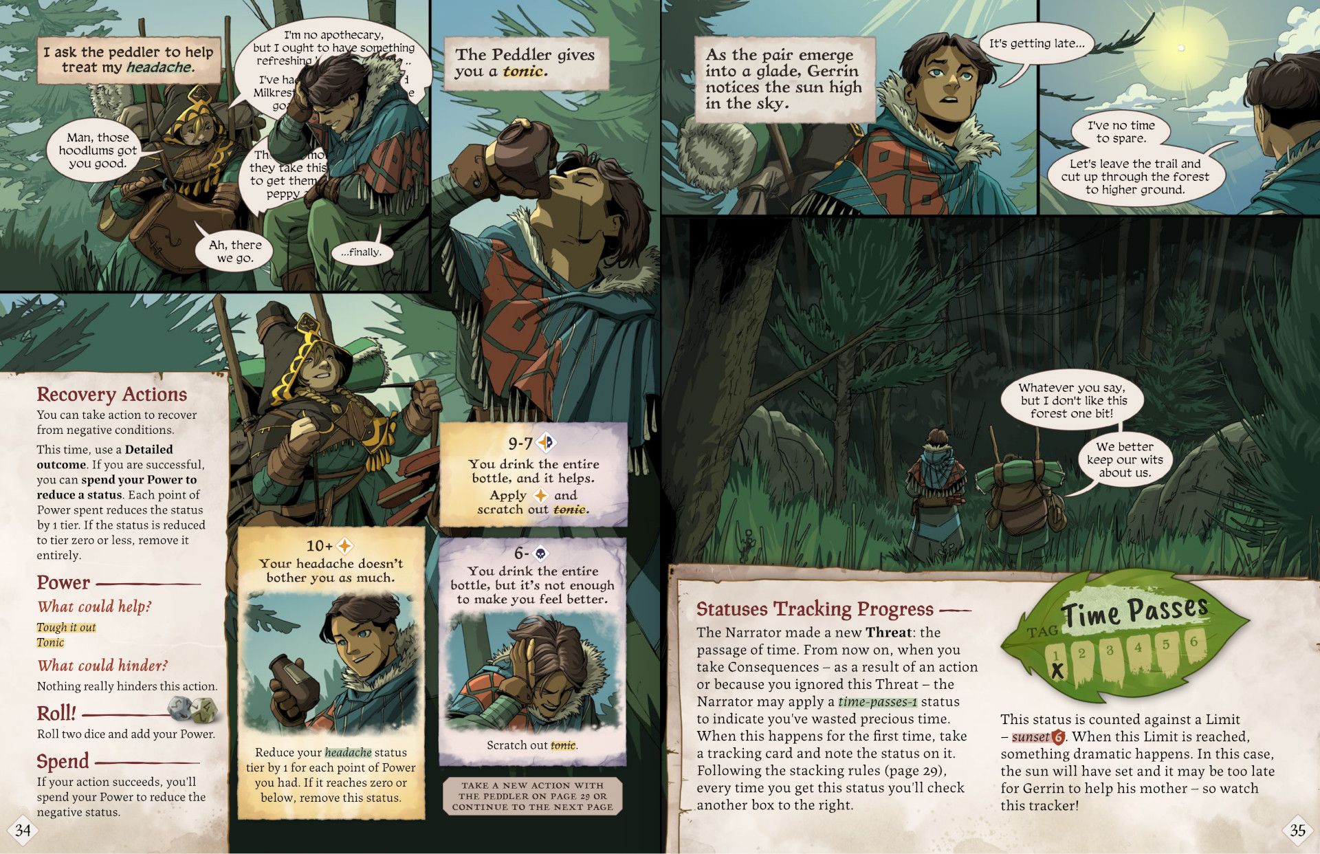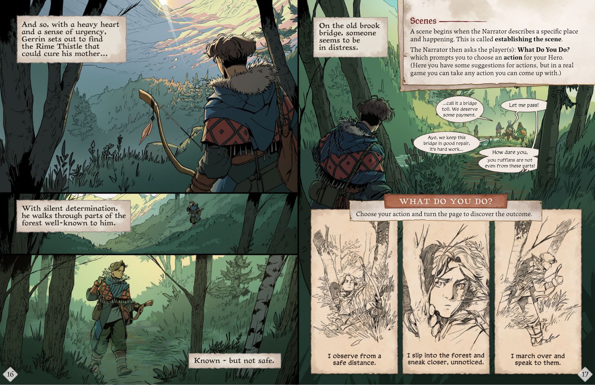 The comic acts as an on-page narrator, guiding the Hero (the player) through a short introductory adventure. Consequently, you don’t have to sit through a long rules lecture. Instead, the rules are introduced in context as you make decisions and see their consequences. Also, the tutorial shows you the world, the tone, and the basic flow of play so you can jump into the full game with fewer stumbling blocks.