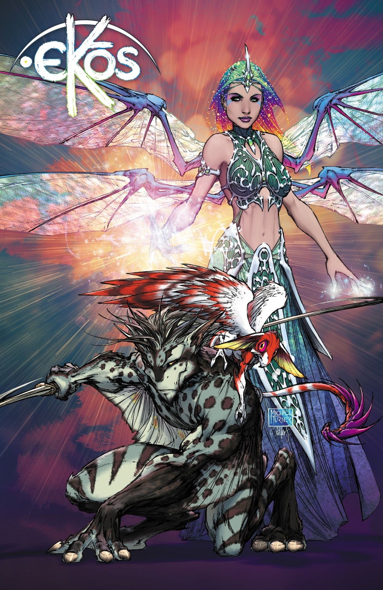 Ekos began as a six-page comic by Michael Turner and Geoff Johns published in Wizard magazine in 2004. It introduced Grell, originally a gliding, feline humanoid whose planet was invaded by humans. Turner later co-created Fathom and Soulfire, and his characters have continued to have a following after his death in 2008 at age 37.