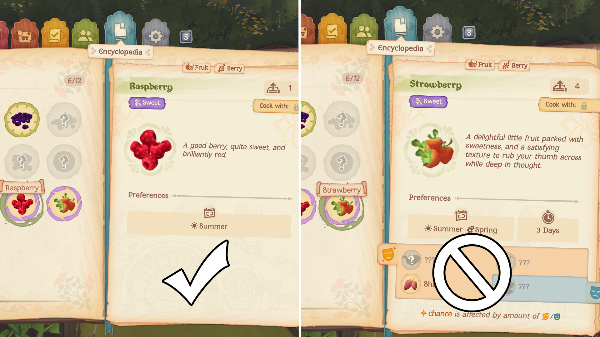 Not everything in the wild can be picked up right away. To figure out if an item is forageable, check the encyclopedia: if an ingredient only shows a preferred season, it means you can find it in the wild. But if it has details about sprouting times or garden companions, you’ll need to grow it in your garden. For example, raspberries are forageable, while strawberries require gardening.