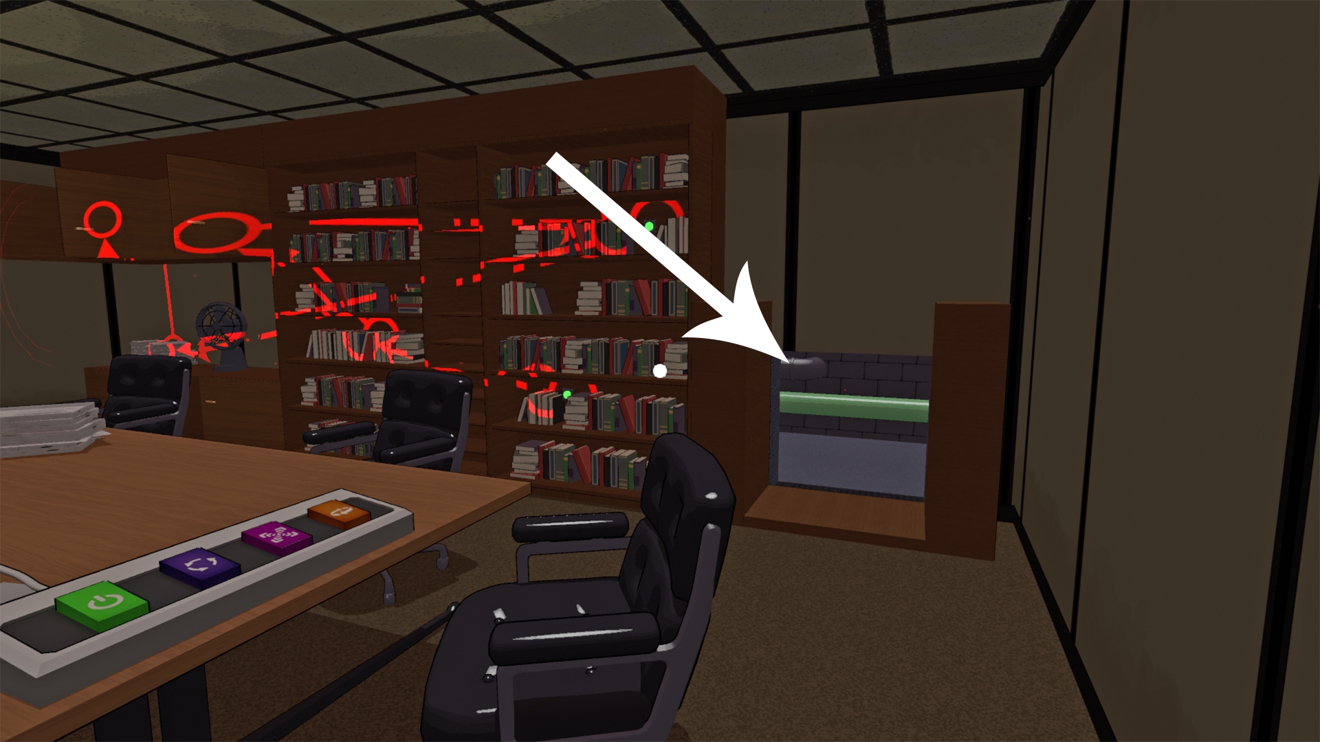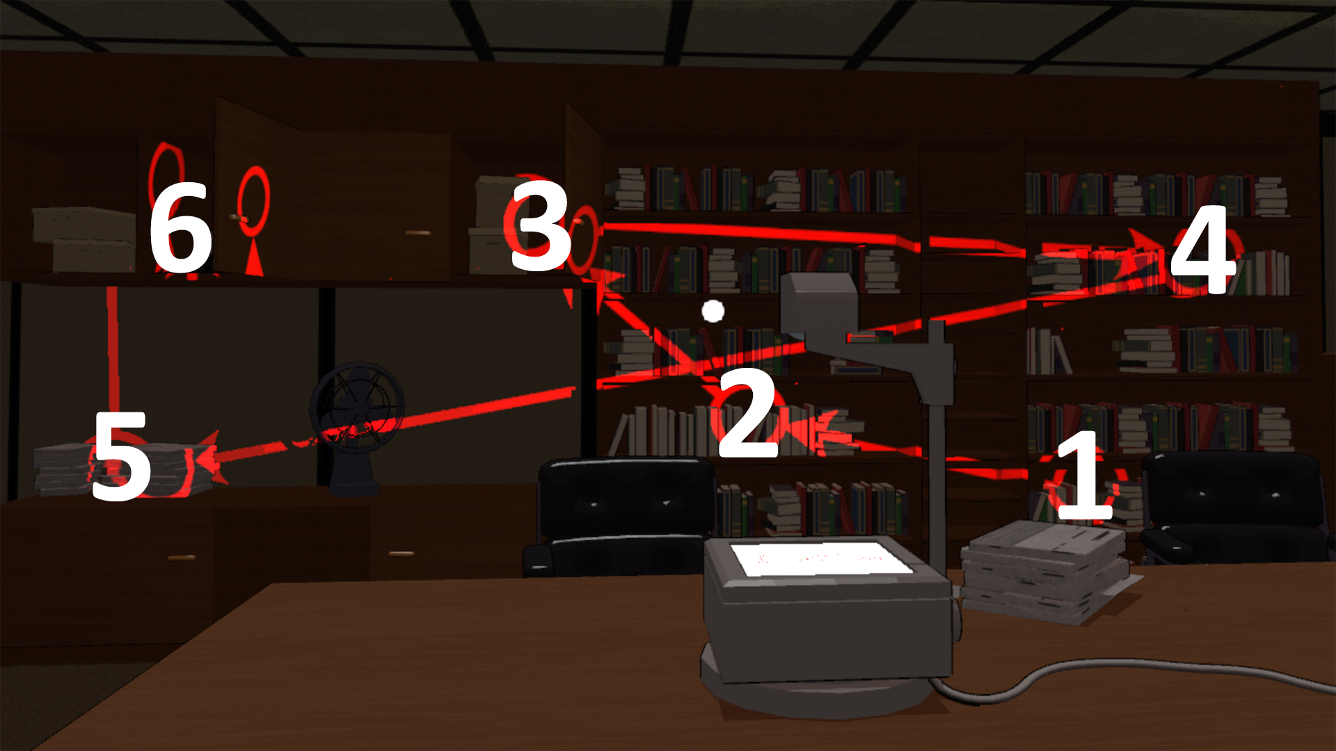 When done right, the projection reveals hidden tiny buttons inside the red circles on the bookcase. Press these buttons in the order the red arrows point. Some buttons are hidden inside cabinet doors, so don’t forget to open those.