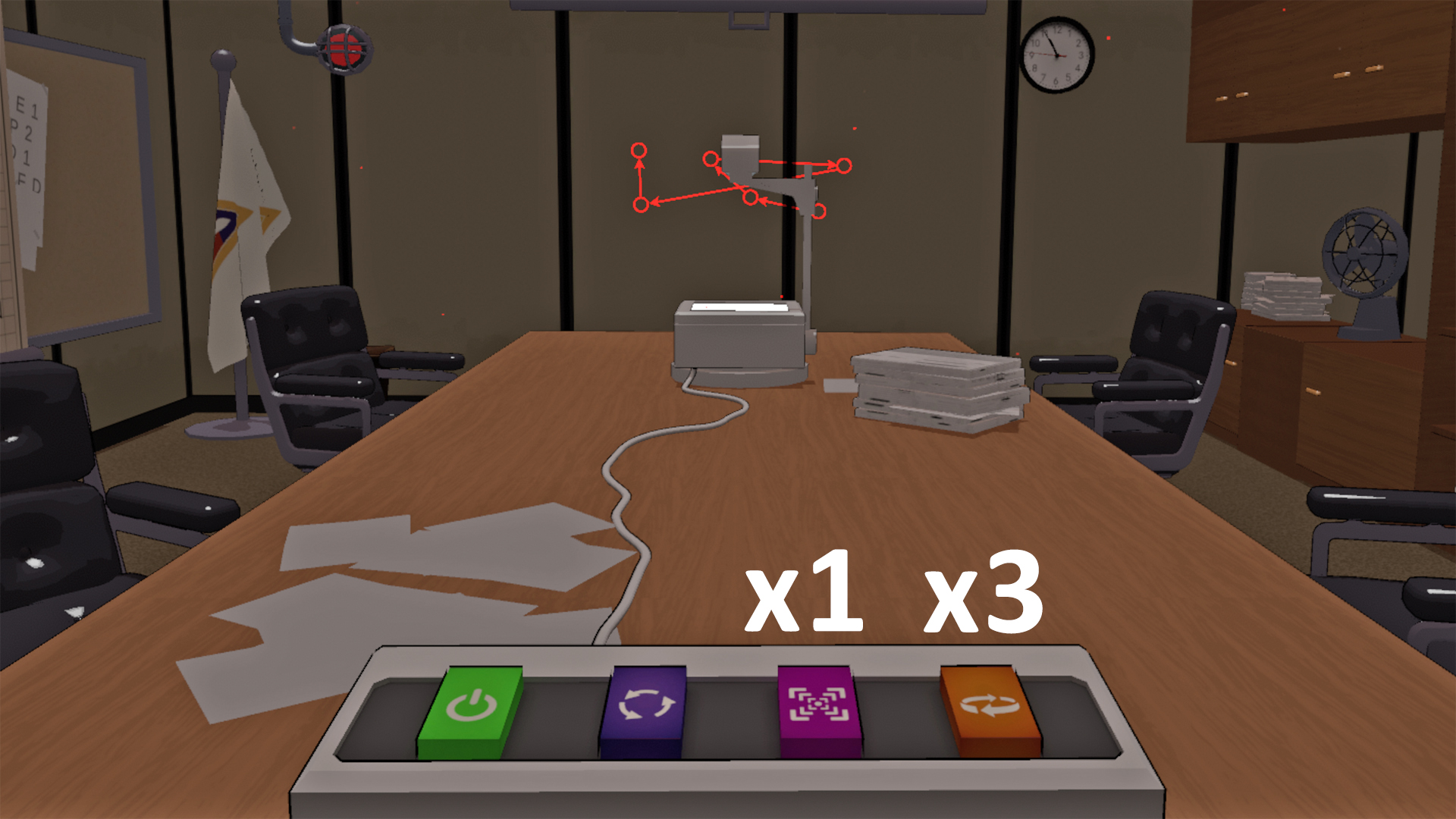 Once you meet Rahim and get the yellow keycard, head to the Briefing Room in the West Hall. Inside, you’ll see a red projection made up of arrows and circles. This is your main clue. Using the control panel on the table, you can adjust the projection’s size, rotation, and placement.