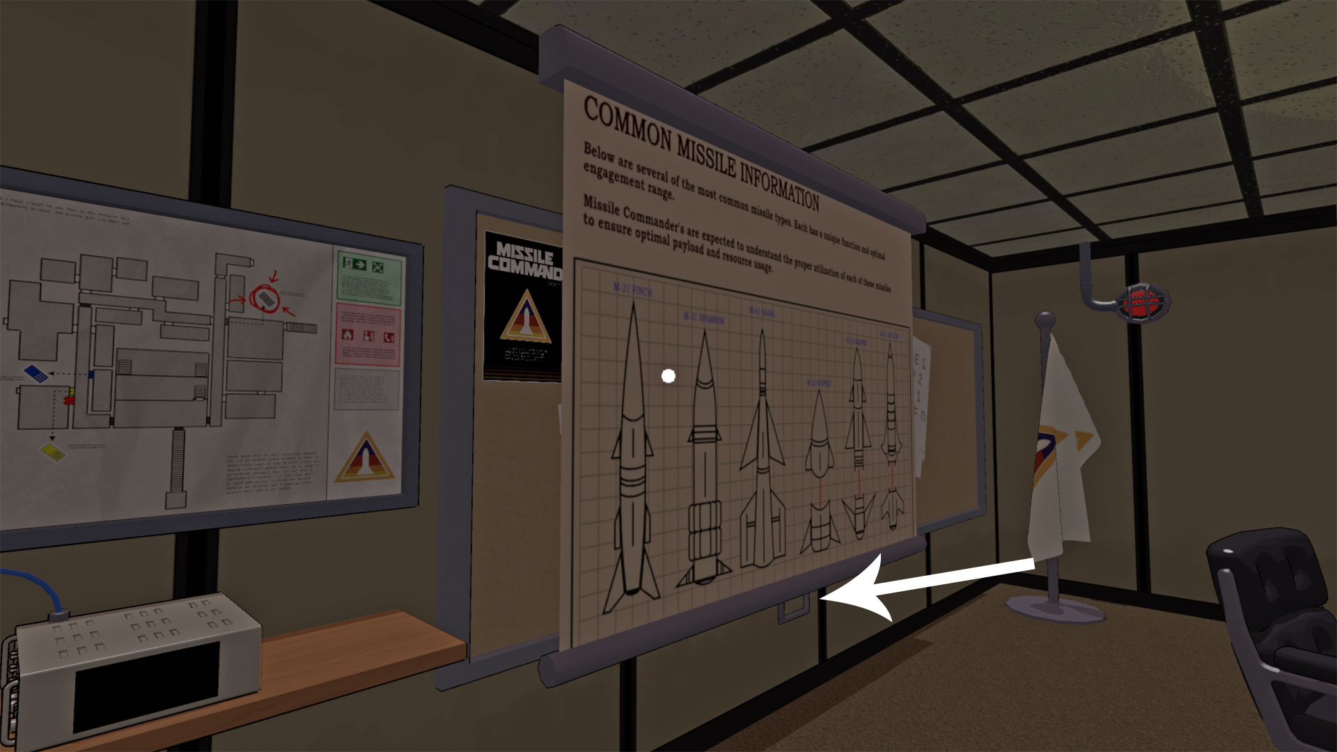 The keypad code isn’t visible on the missile schematic poster itself but hidden behind it. Walk up to the poster and look near the small handle at the bottom. You’ll get a prompt to remove it, revealing a set of numbers and letters.
