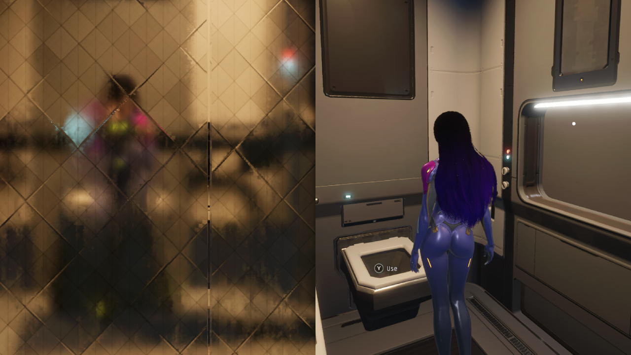 When you’re not in battle, you can roam around your pilot’s living space on the dropship. Here, your pilot can relax, use their PC, or enjoy the bathroom amenities. The shower is fully functional and even has a cutscene showing your pilot bathing—although privacy glass and steam keep things modest. The toilet also has a cutscene, but this one is surprisingly weird: your pilot remains fully clothed in a skin-tight bodysuit, which has no obvious openings for bathroom use.