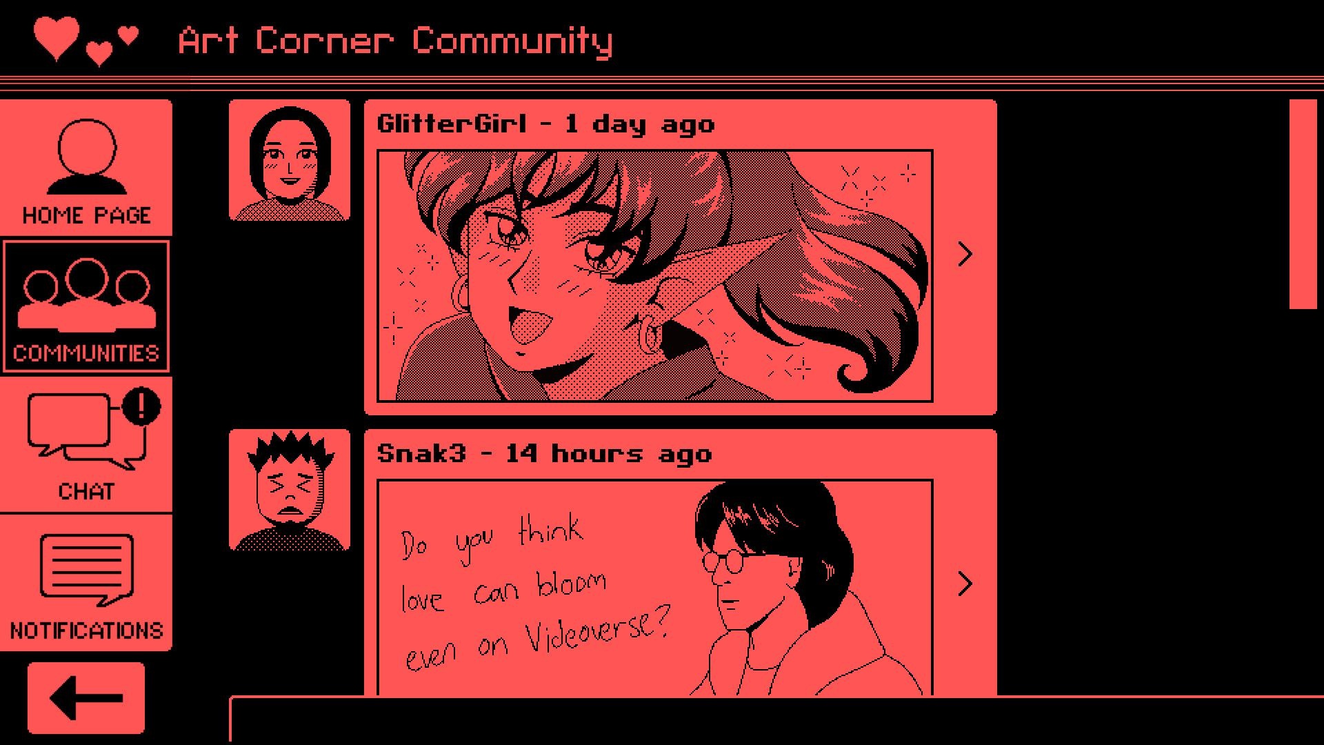 Videoverse is a five-hour visual novel set in 2003. It follows Emmett, a young gamer who joins a social app built into the Kinmoku Shark — a Dreamcast-like console with video chat and community message boards. The app in the game is closely modeled after Nintendo’s Miiverse, and the story unfolds through comment threads and video chats.