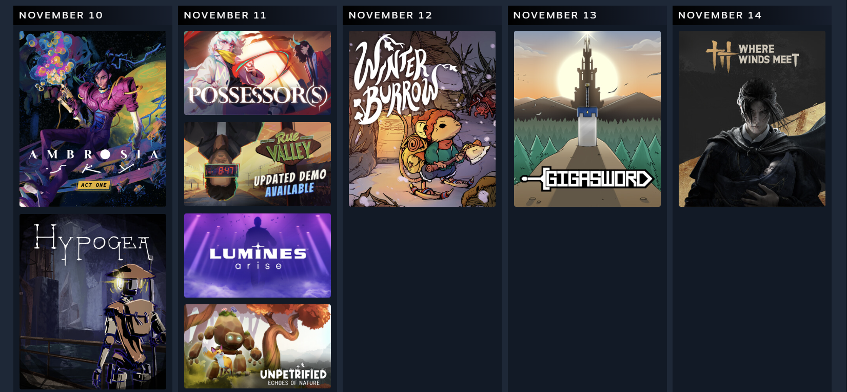 Steam’s announcement and the calendar itself link to specific games and to Steam’s experiment discussion. For example, some indie titles mentioned by users as appearing in personalized feeds include Hypogea, Ayasa: Shadows of Silence, and Unpetrified: Echoes of Nature. The calendar also shows titles you’ve already wishlisted, helping centralize release dates for games you care about.
