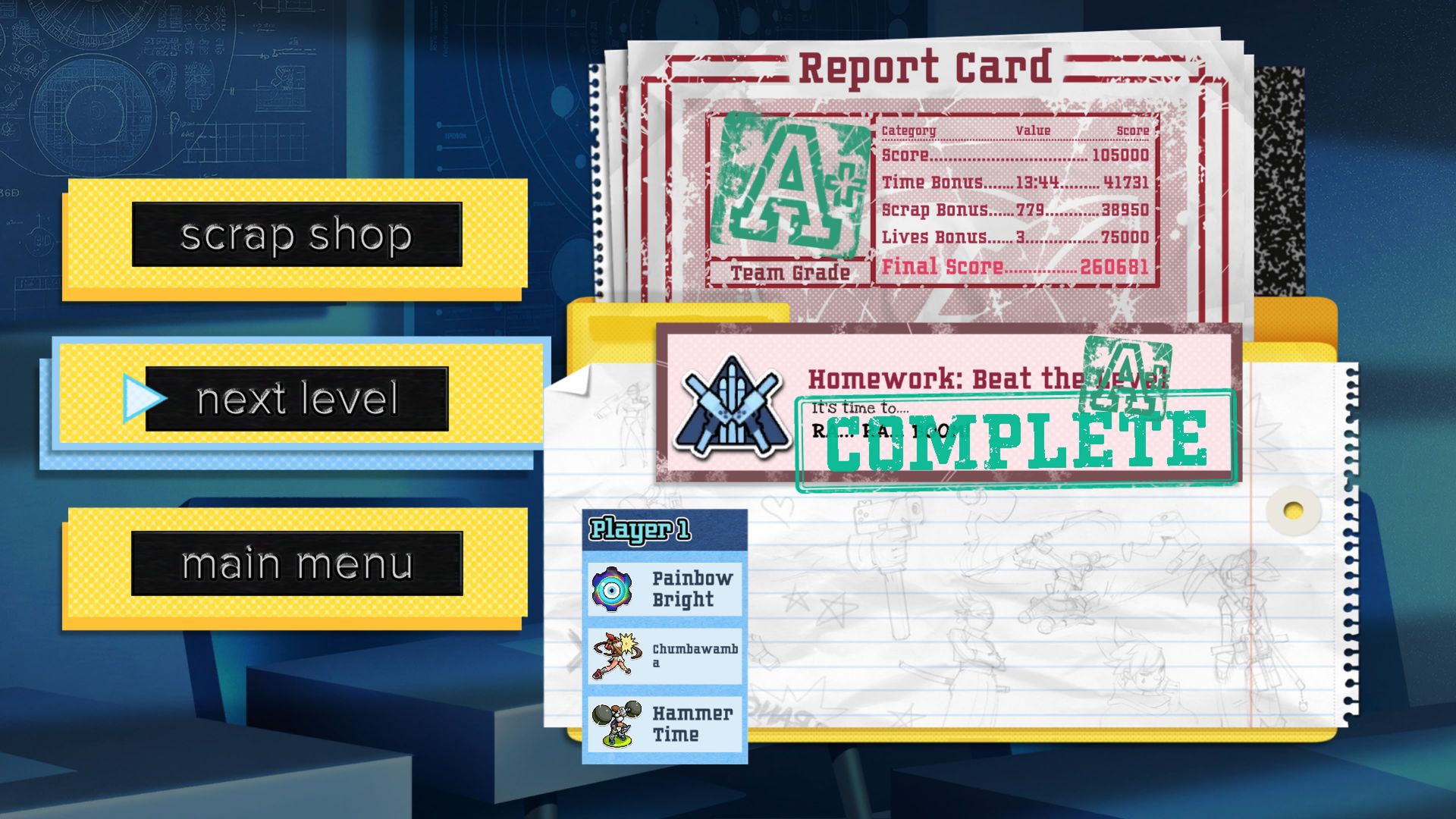 Each level has a Homework Assignment that changes objectives on replay — for example, replaying a level using melee-only. However, there are no options to change overall difficulty, and the final boss and main villain have been described as underwhelming by players who have finished the game. Overall, Scrap Metal collection is the largest factor in end-of-level grading, and some players may finish progression trees early.