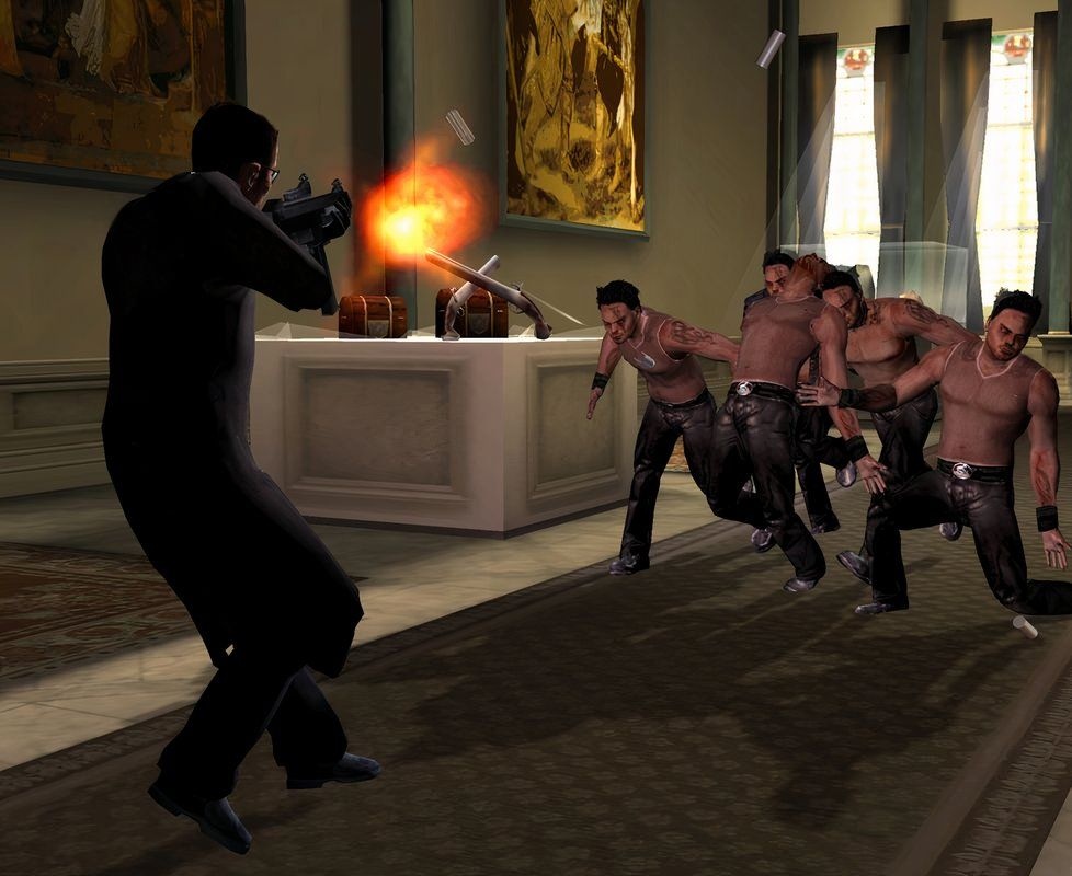 Enter the Matrix implements a bullet time system that reduces game-time speed to let players aim, dodge, and perform acrobatic moves more precisely. The mechanic is available in third-person perspective, and it applies both to gunplay and melee. Furthermore, the game supports vaulting and aerial animations while bullet time is active, which lets players chain movement and attacks in ways that are different from normal-speed play.