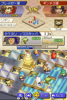 Battles are turn-based and take place on small, diorama-like grids. Players control squads of up to six Pokémon, move them across tiles, attack enemies, pick up items, and use special Warrior skills. Type matchups matter, so choosing the right Pokémon for each encounter is important.