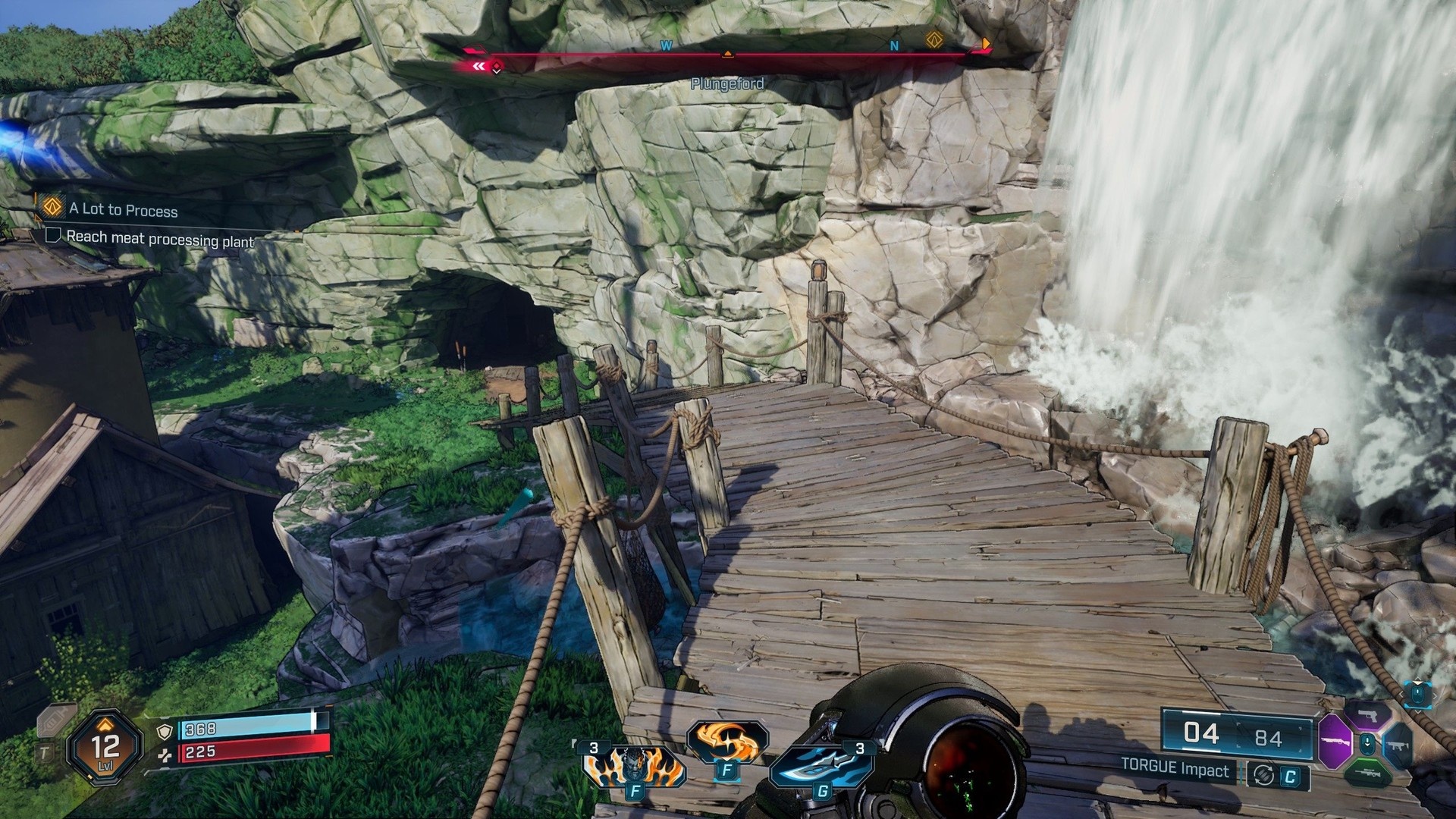 Your final objective points you north to Plungeford, a large ripper encampment. However, the cave is at the very top of the settlement, next to a waterfall — not behind it or behind smaller falls lower down. You can clear the rippers for XP or ignore them and enter the cave directly.