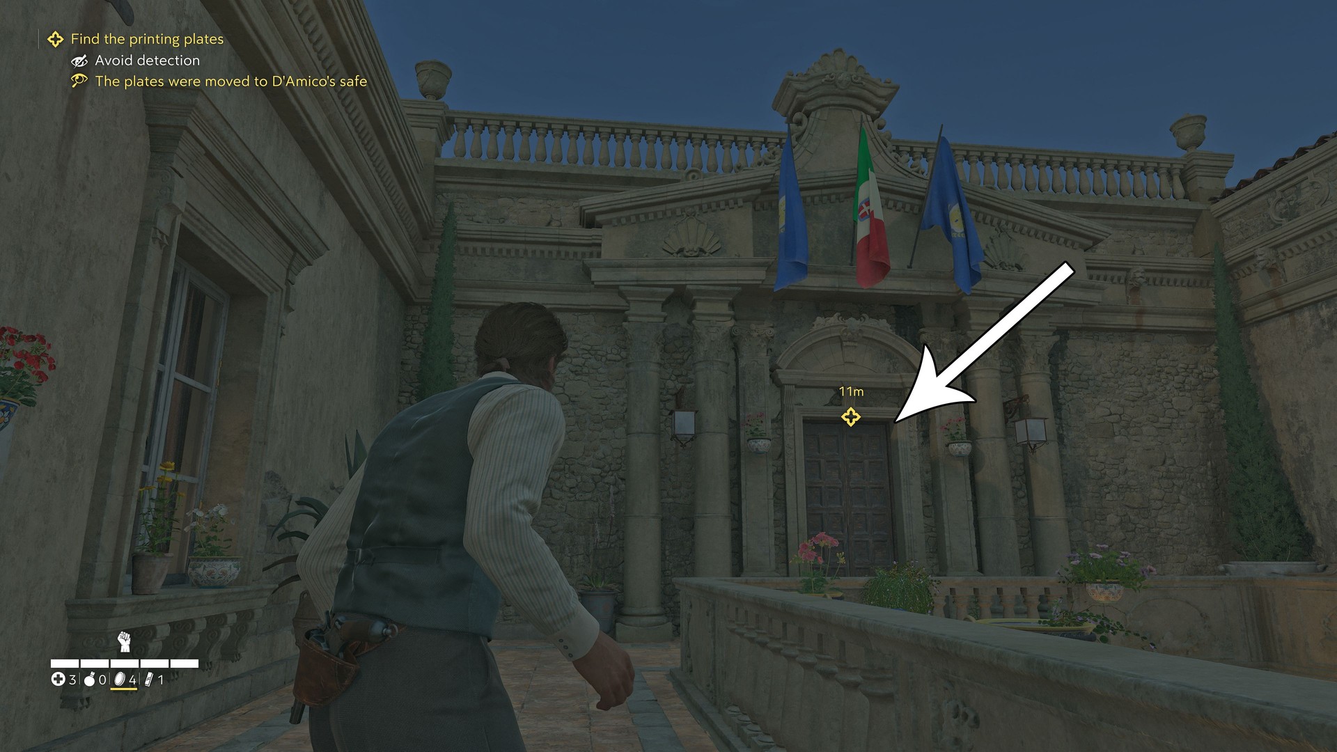 Inside the fourth safe you open, you’ll find a note pointing you to D’Amico’s safe and listing its code. To reach D’Amico’s office, go upstairs, cross the courtyard (watch for guards), and enter through the large door beneath the three flags. The code is also written on a note on D’Amico’s desk.