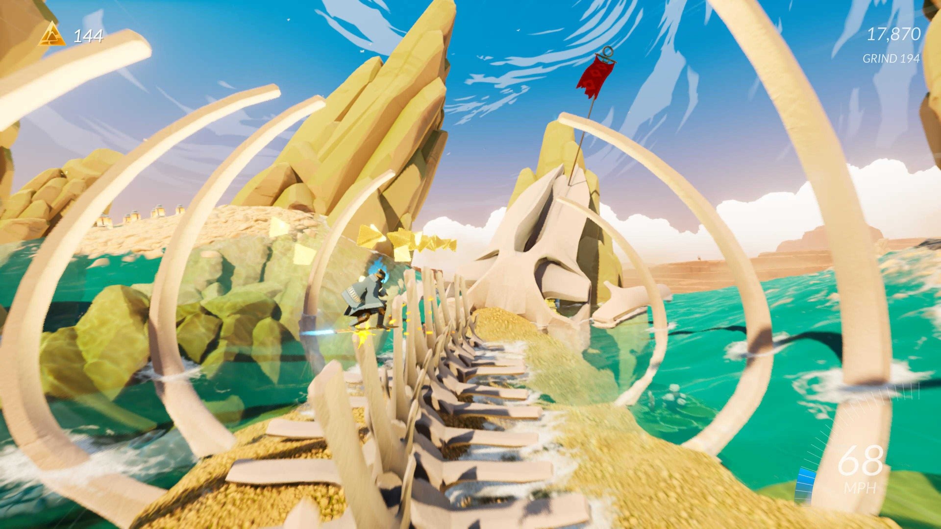Sword of the Sea centers on continuous movement. Players surf across sand and water, grind on oversized chains, and perform tricks to build momentum and points. Moreover, the game’s controls are built around fluid traversal rather than combat, and many actions are tied to maintaining speed and chaining maneuvers.