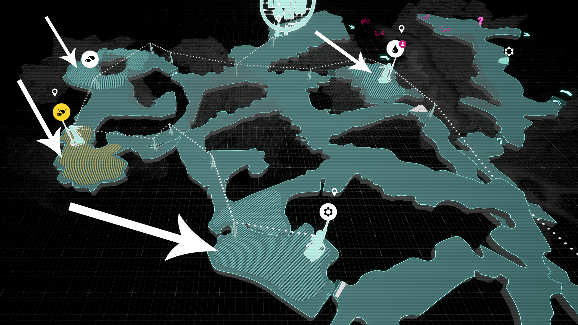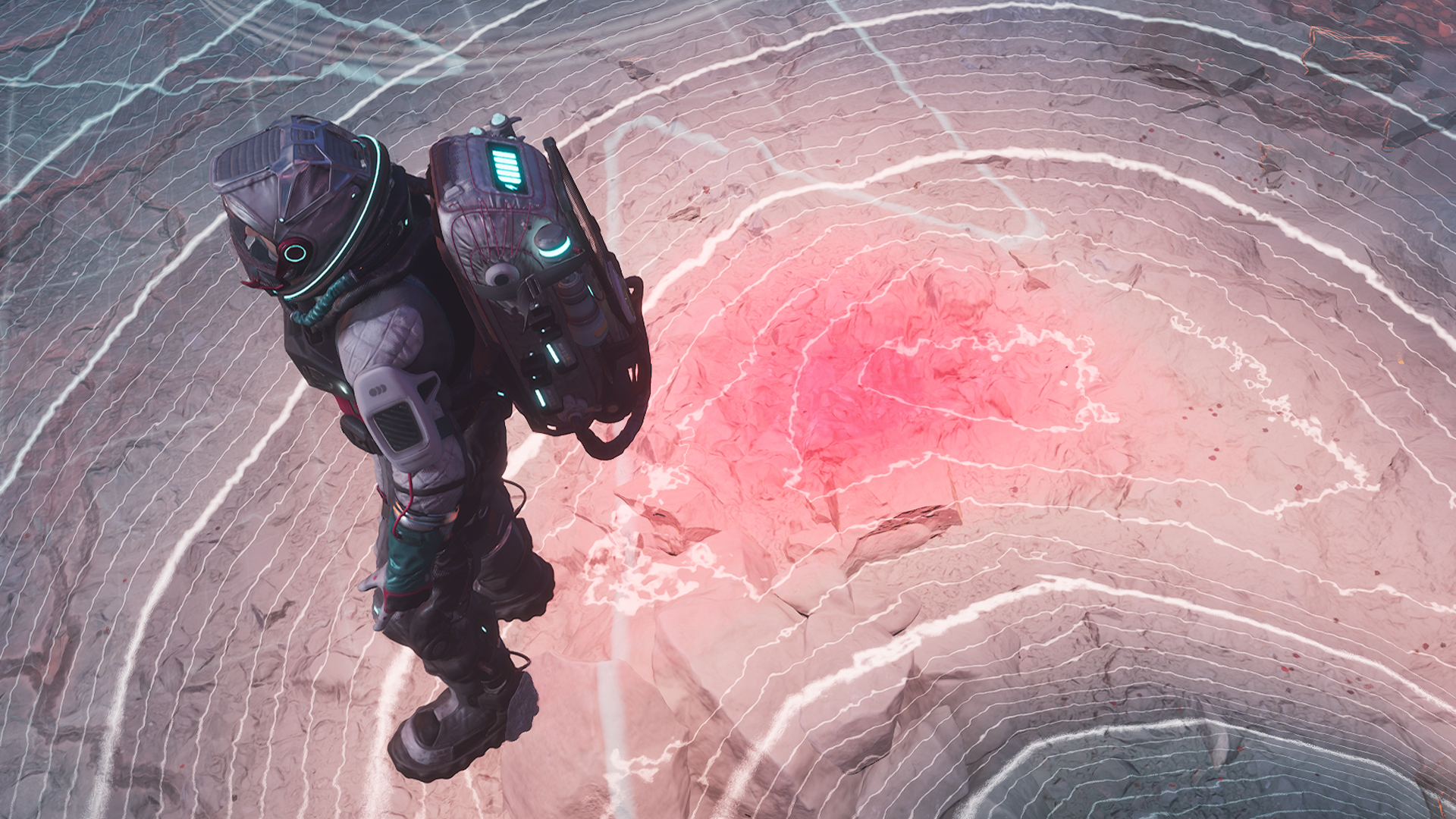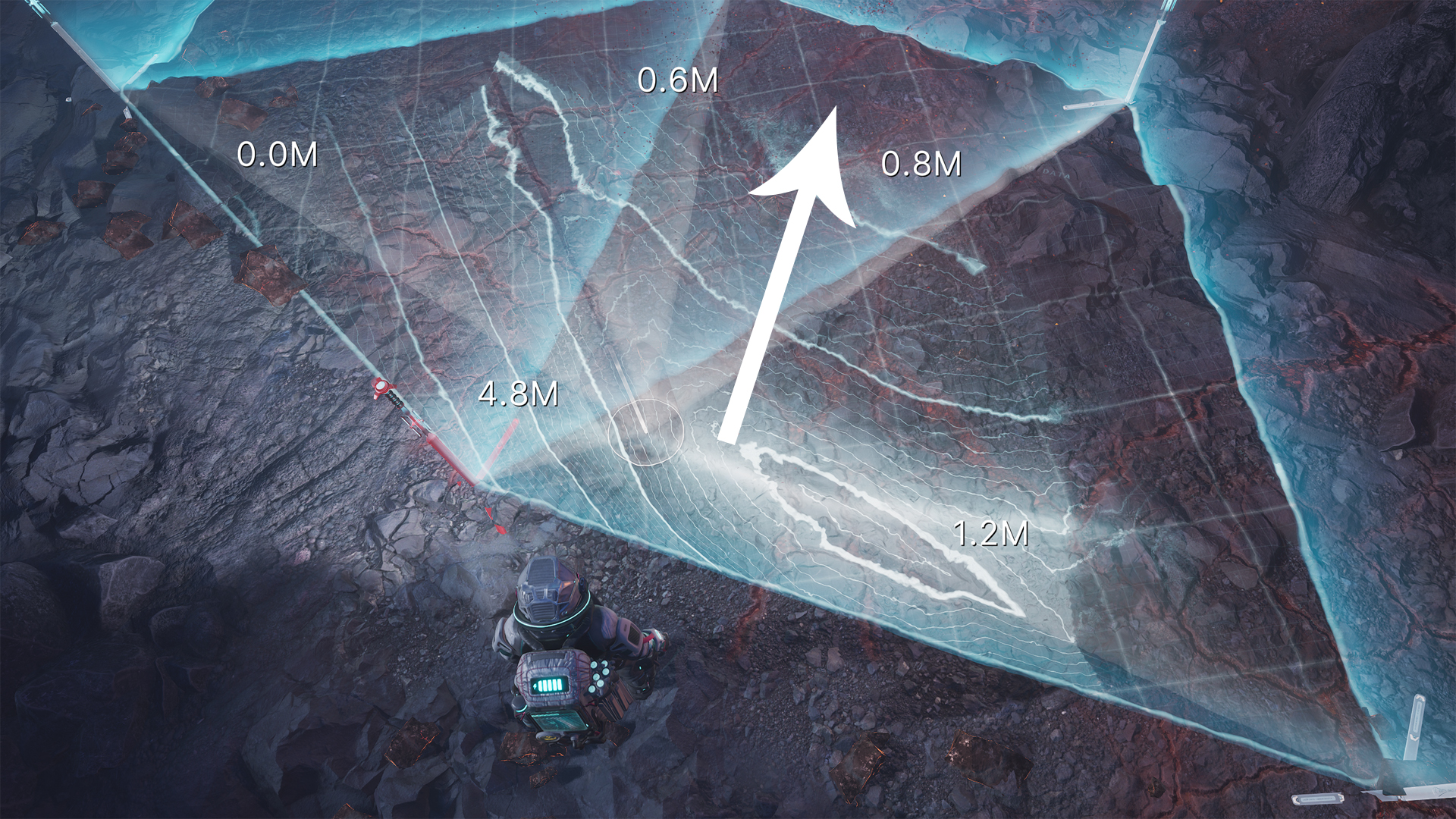 Scan Waves, unlocked at the start of Act 1, make things even easier. After placing your Polygonal Scanners, hit the Scan Wave button and look for moving lines on the ground. These lines point straight to the deposit core, so follow them with your next scanner placement. In the example below, a thin white line moves upwards—head that way!