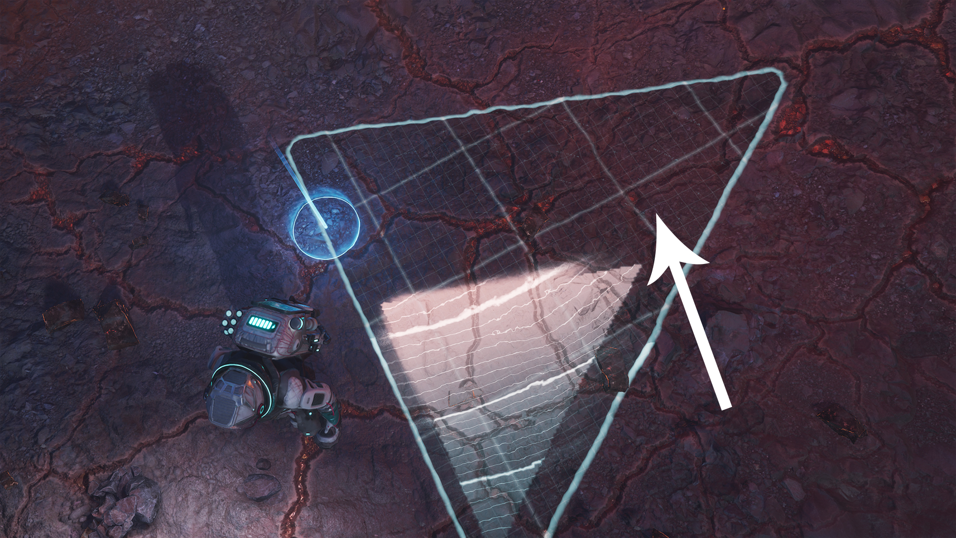 No worries! Just pick up your Polygonal Scanners and try again. Here’s a trick: watch for color changes in the ground—the more reddish it looks, the closer you are to the core. Move your scanners toward that spot for your next attempt. In the image below, the arrow points you in the right direction based on color.