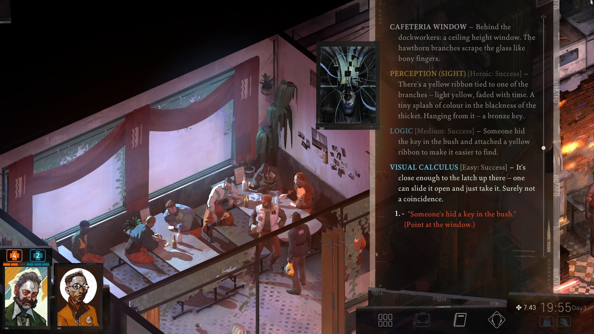 Visual Calculus appears as one of Harry’s intelligence-based skills. When a player passes Visual Calculus checks, the game presents reconstructed visuals or deductions about a scene. These reconstructions often describe details a trained eye could notice and, therefore, can provide factual clues for further investigation.