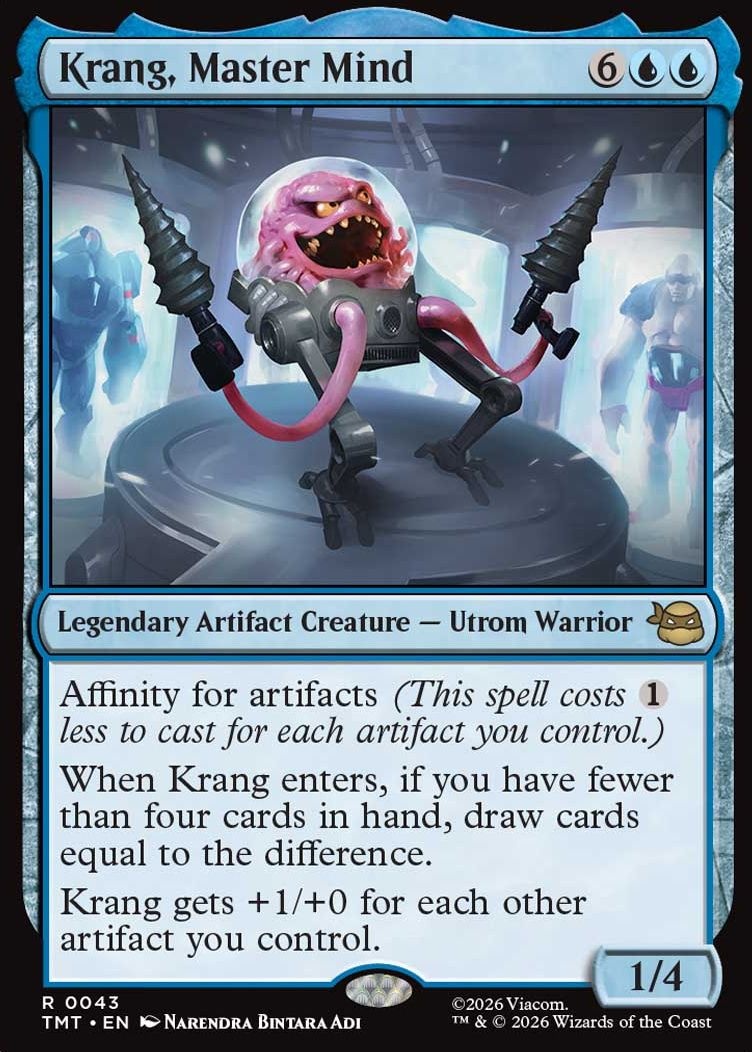 In short, Krang brings a clear, concrete upgrade to Affinity’s late-game card advantage while still fitting the archetype’s artifact-heavy strategy. The card’s printed stats and effects make it a card worth testing in Modern lists once the TMNT set is available on March 6, 2026.