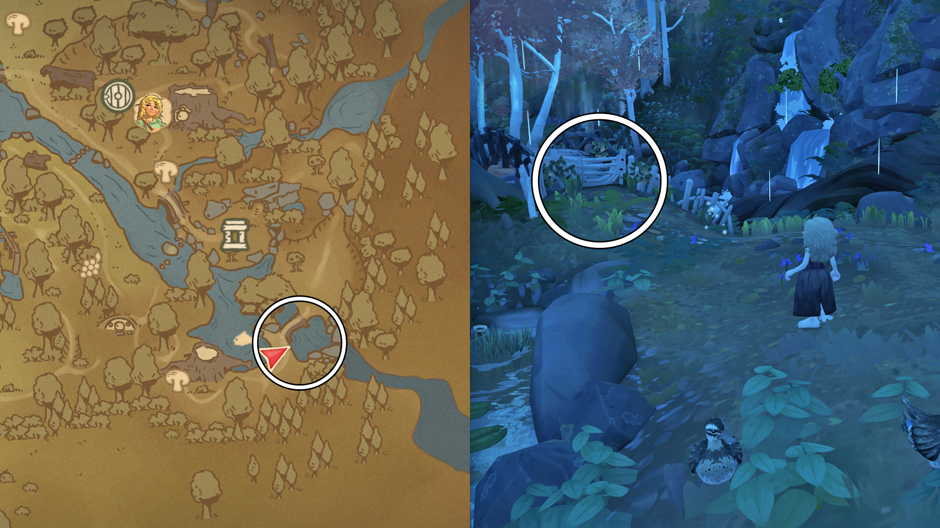 Sounds like a waterfall, right? The tricky part is that there are several waterfalls in the forest east of Bywater. The correct one is located in the southeastern corner of the map, just east of the Tree Root Pool. Look for a small white bridge near a large waterfall — that’s your spot.