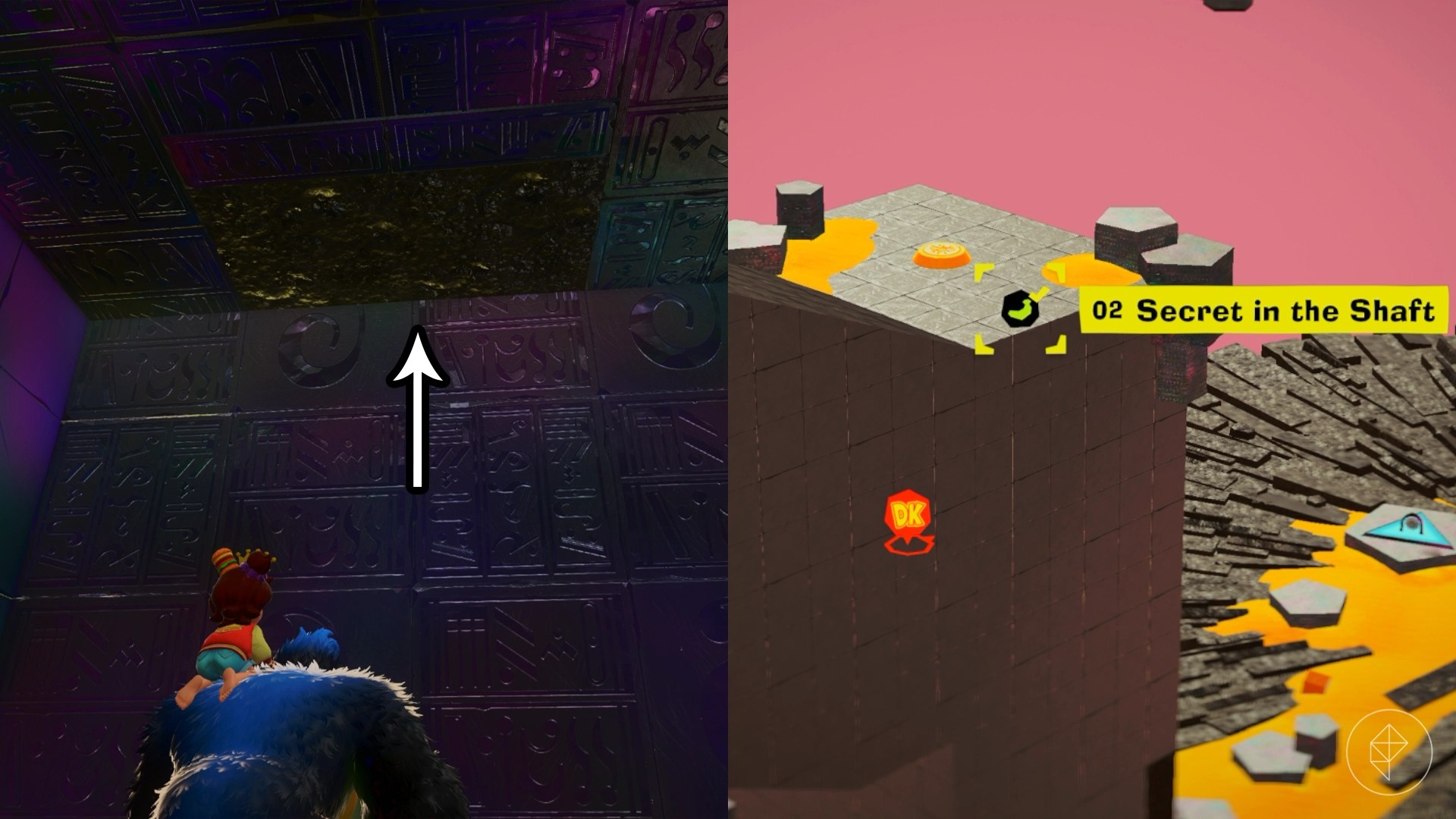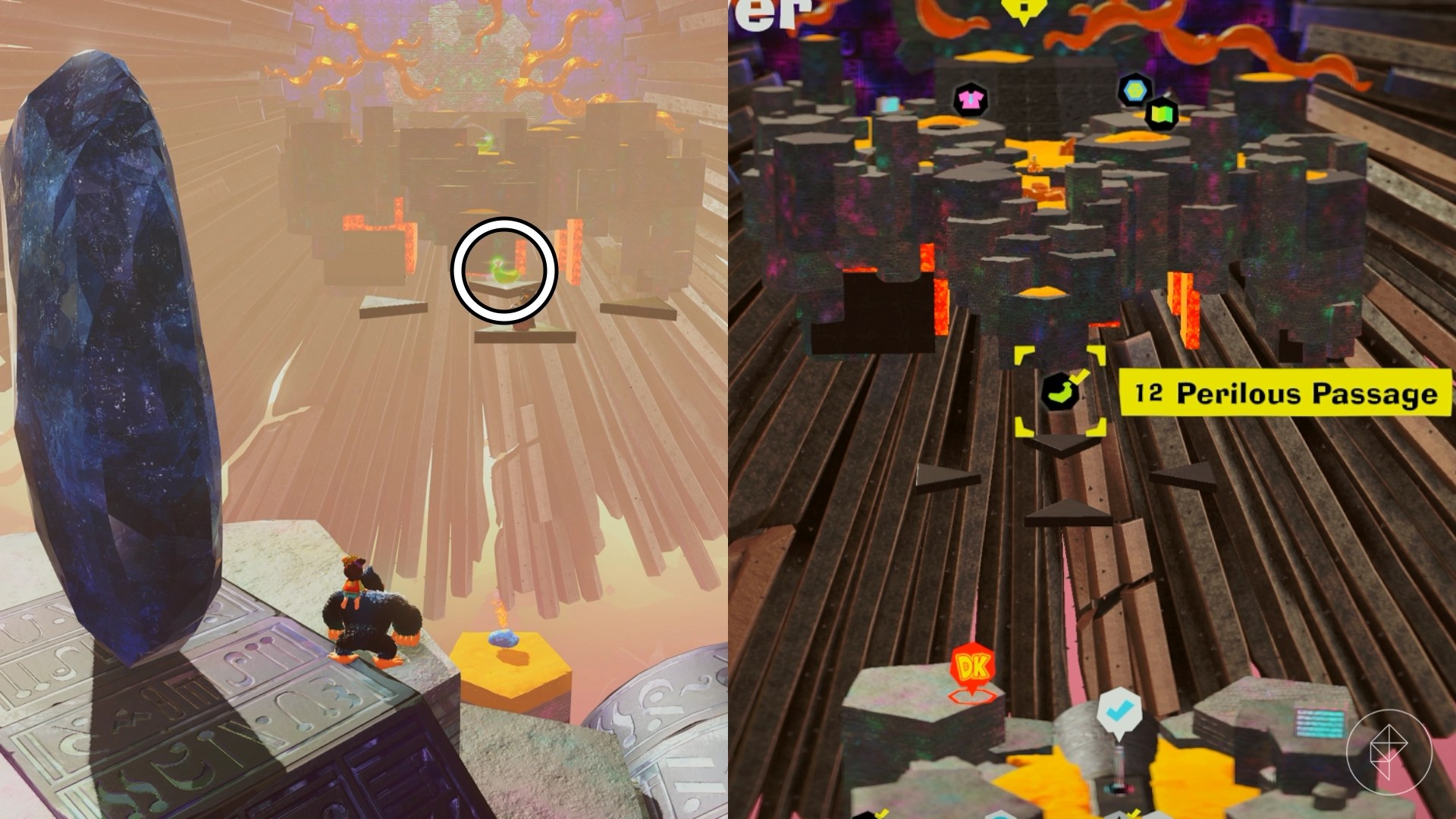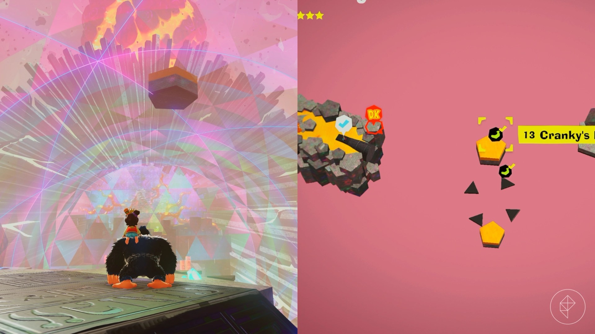 After paying the hefty 9,999 gold fee, cross a rotating prismatic layer to find Cranky Kong and Rambi. Listen to Cranky’s rant to collect this gem.