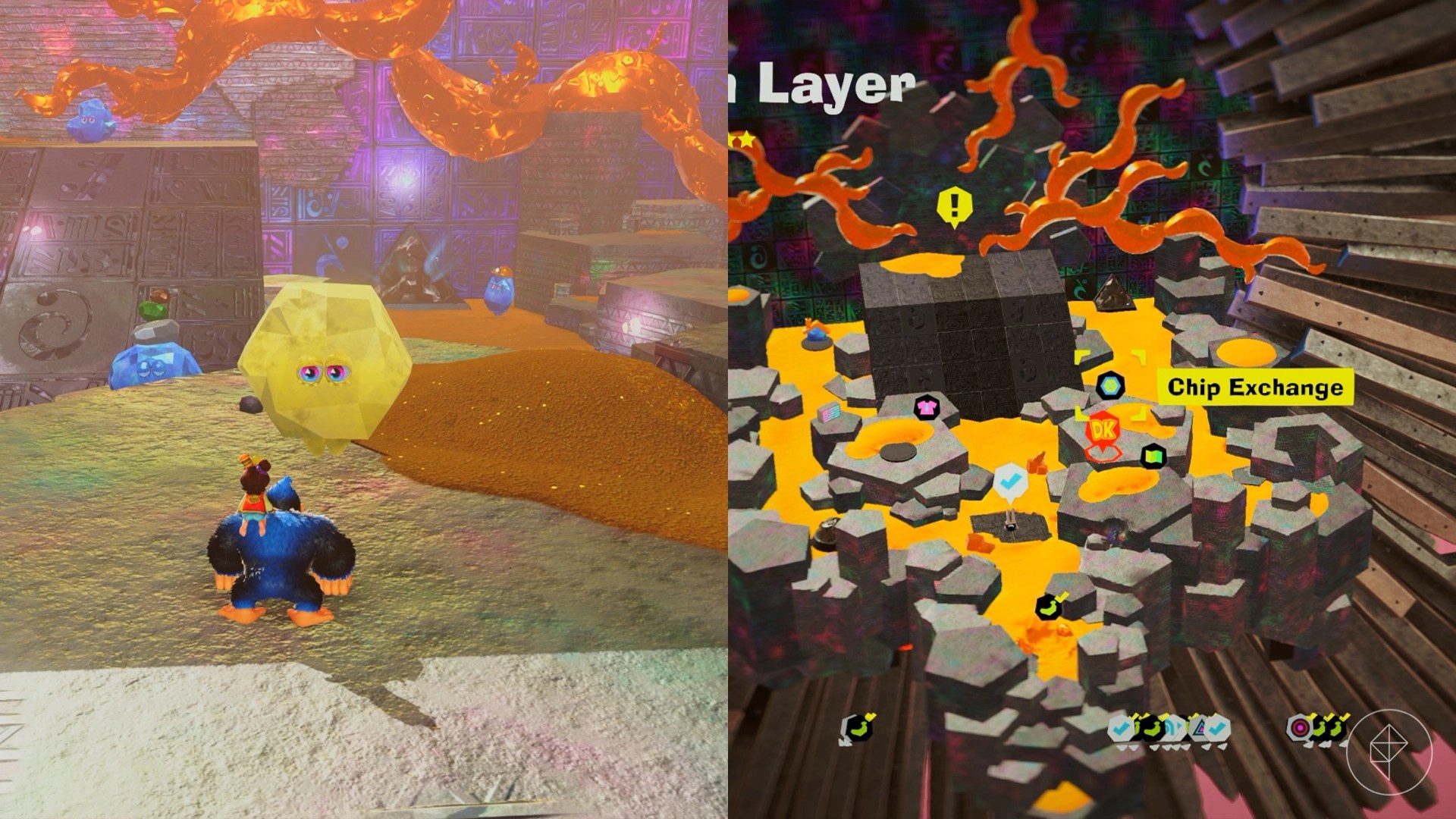 The Forbidden Layer is a sprawling area with floating islands that look impossible to cross at first glance. But with plenty of gold, you can create bridges by throwing chunks of sand and stone, or use your character’s unique forms like zebra, snake, and ostrich to glide and shimmy across gaps. Each Banandium Gem is cleverly hidden, so keep your eyes peeled for secret rooms, shuffling floors, and battle challenges.