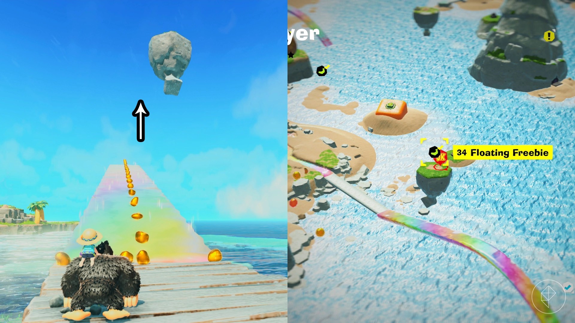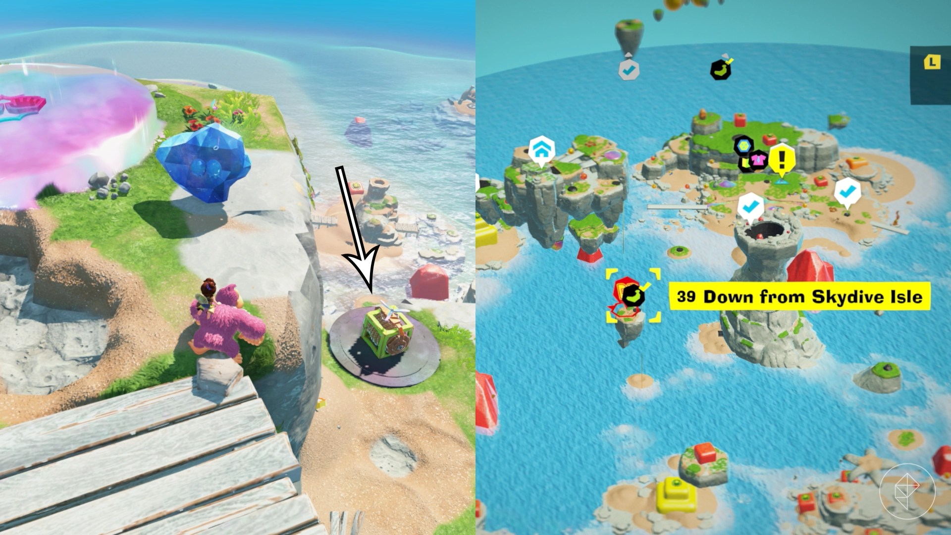 For example, you’ll find gems hidden beneath half-buried rock bananas on the beach, inside giant strawberries on floating islands, and next to tuning forks in the Tropical Retreat. Some gems require completing quizzes or battling trailfinoids, while others involve breaking through cracked walls or activating unique challenges like Shifty Smash.