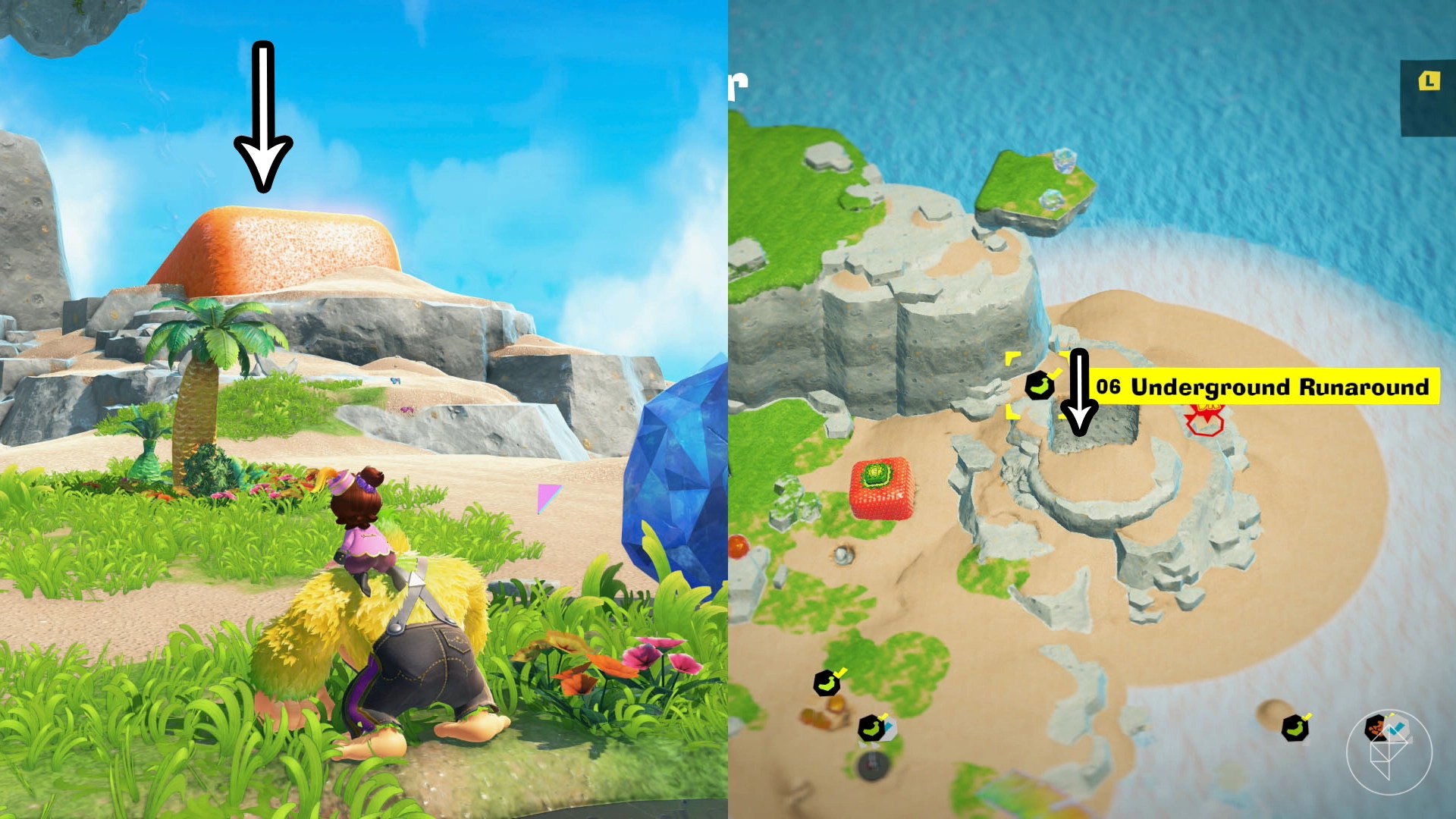- Secret Beachside Grotto: Break a cracked wall near the large rock formation to find a hidden grotto with a gem inside.