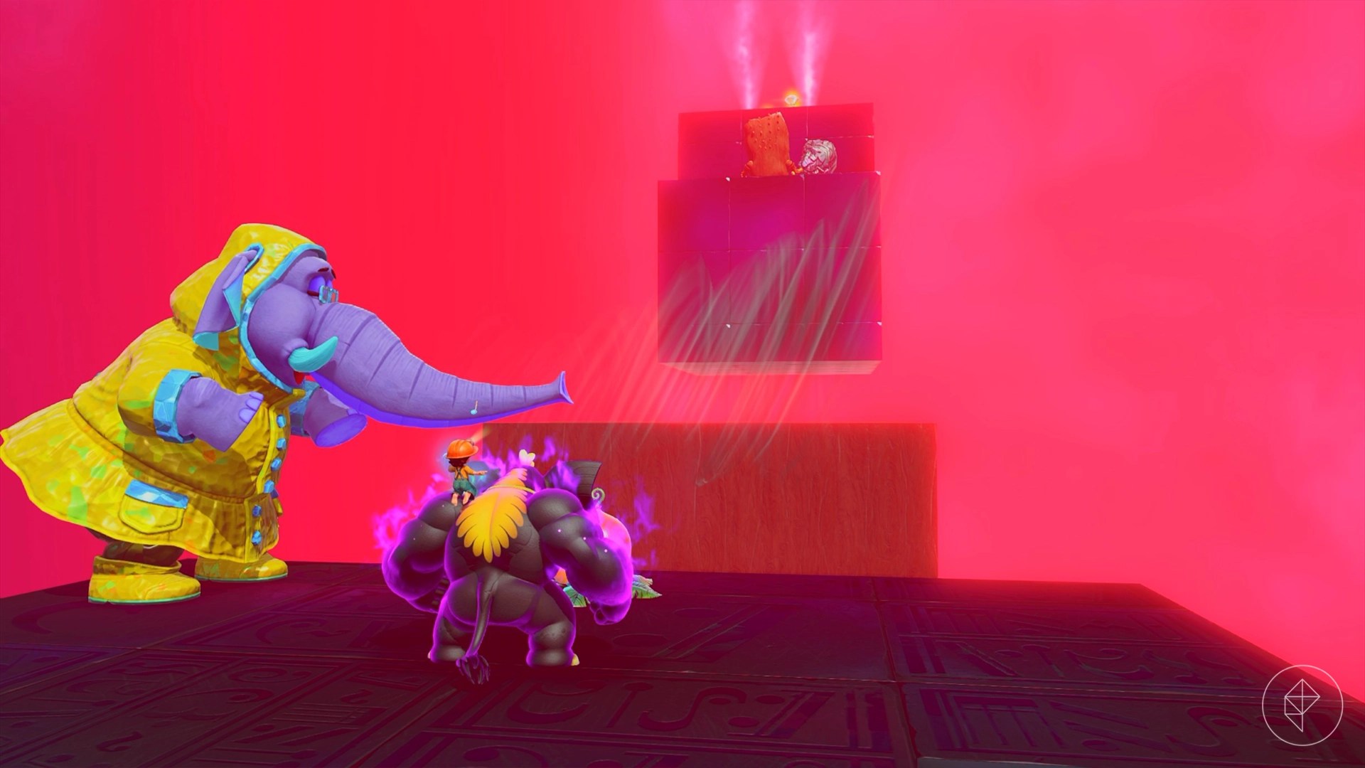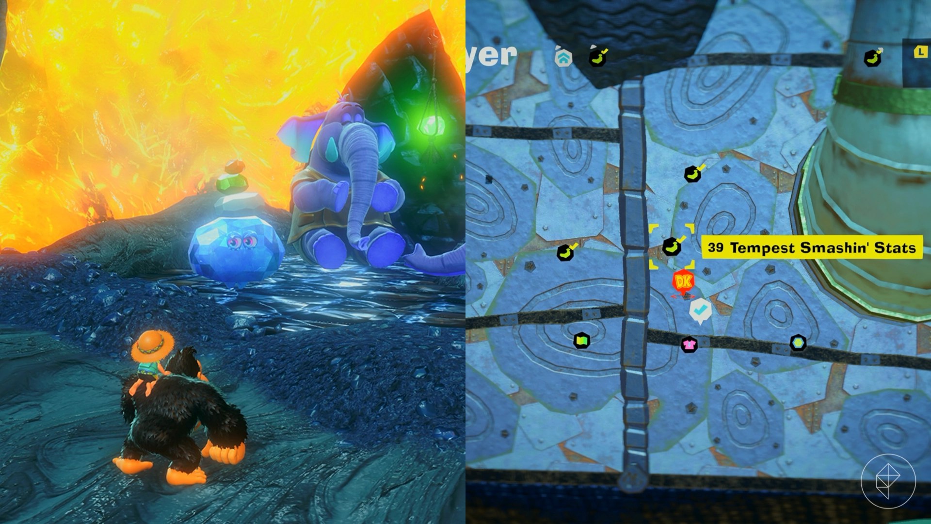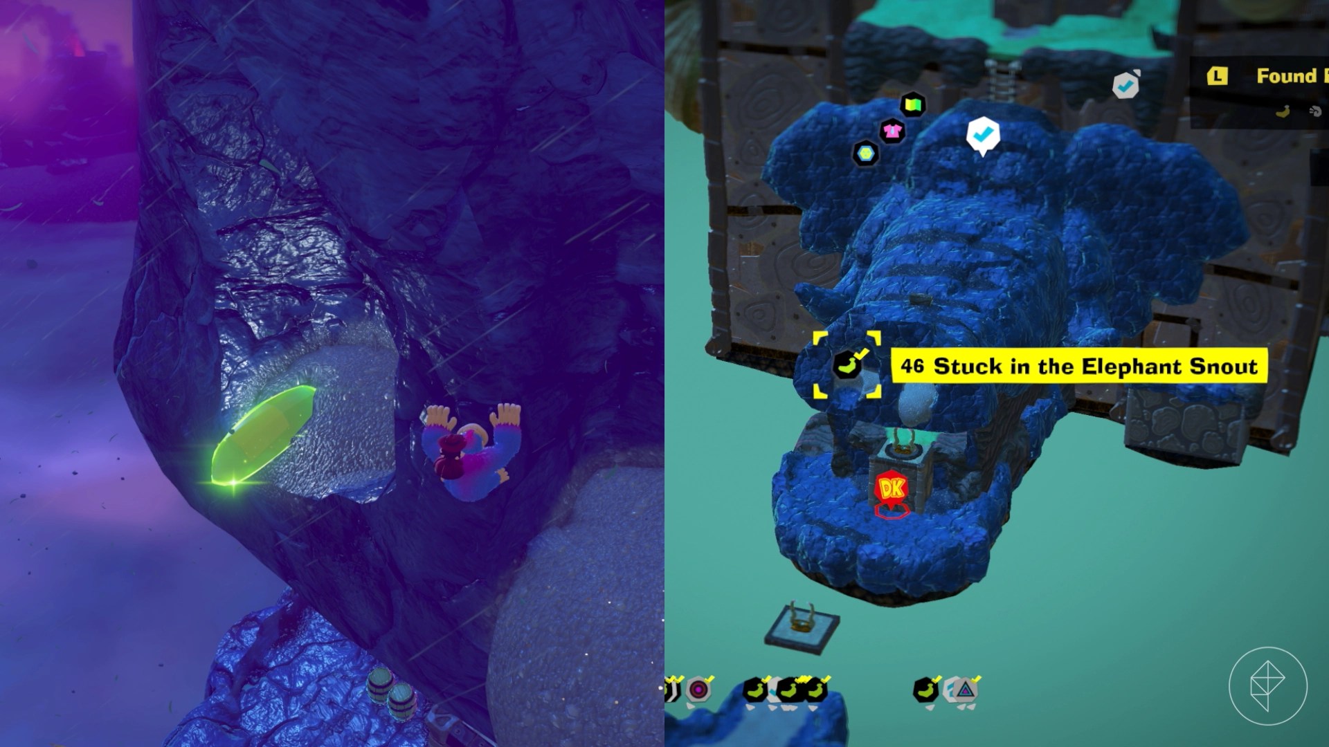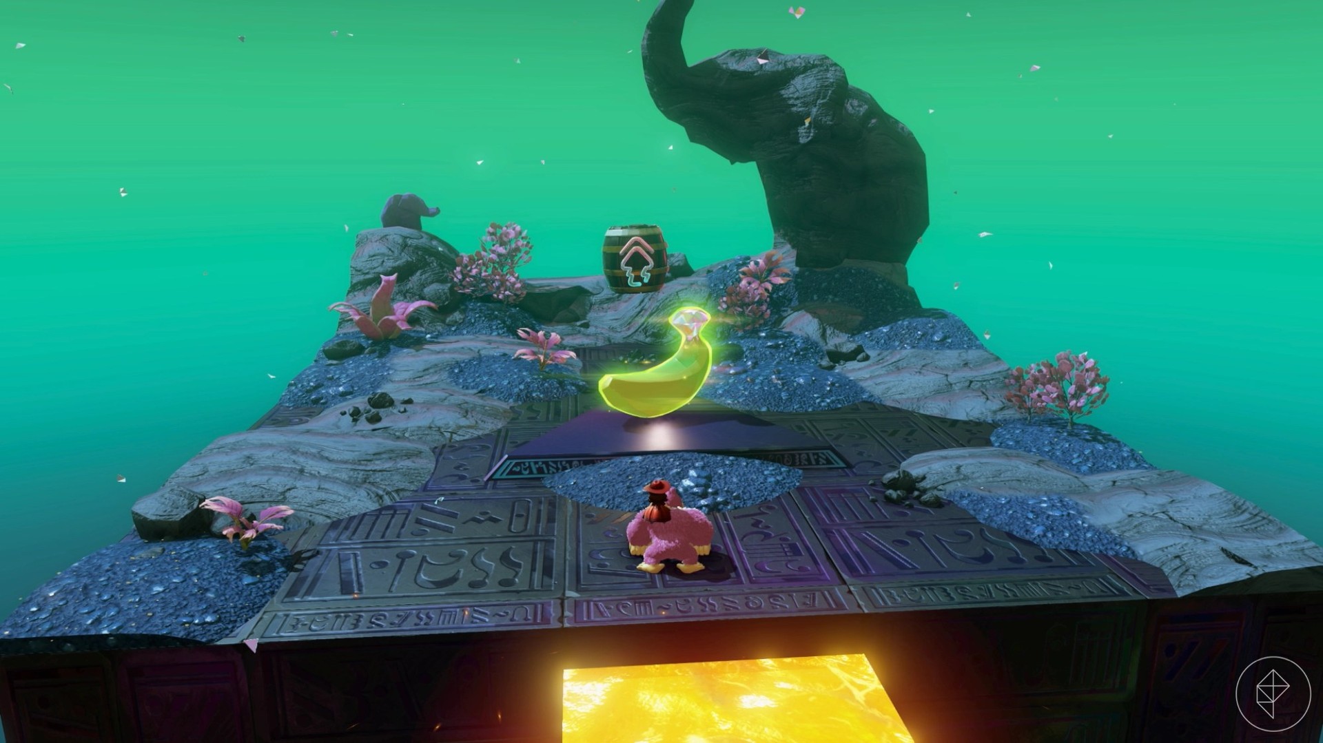 – Explore behind walls and tornadoes, climb shelves, and brave lava to uncover more gems. For instance, breaking a cracked wall behind the Elephant Elder reveals a hidden banana.