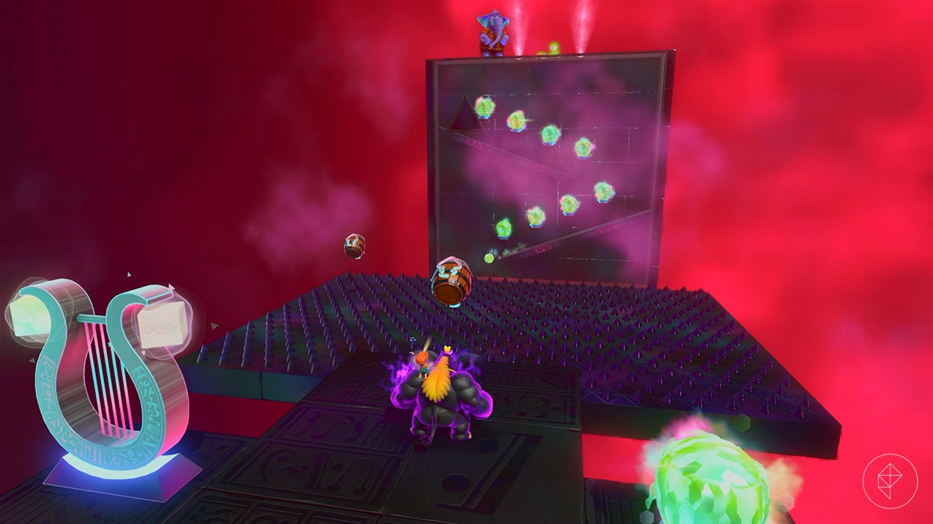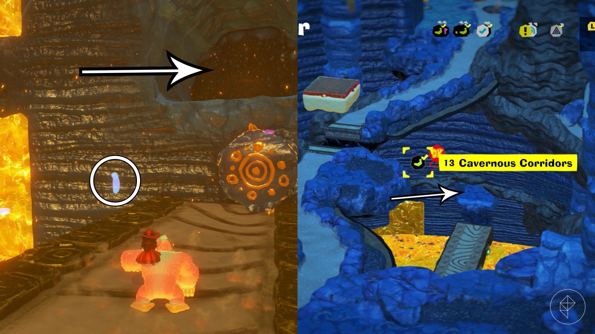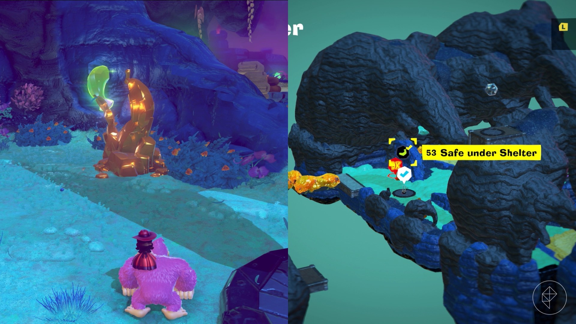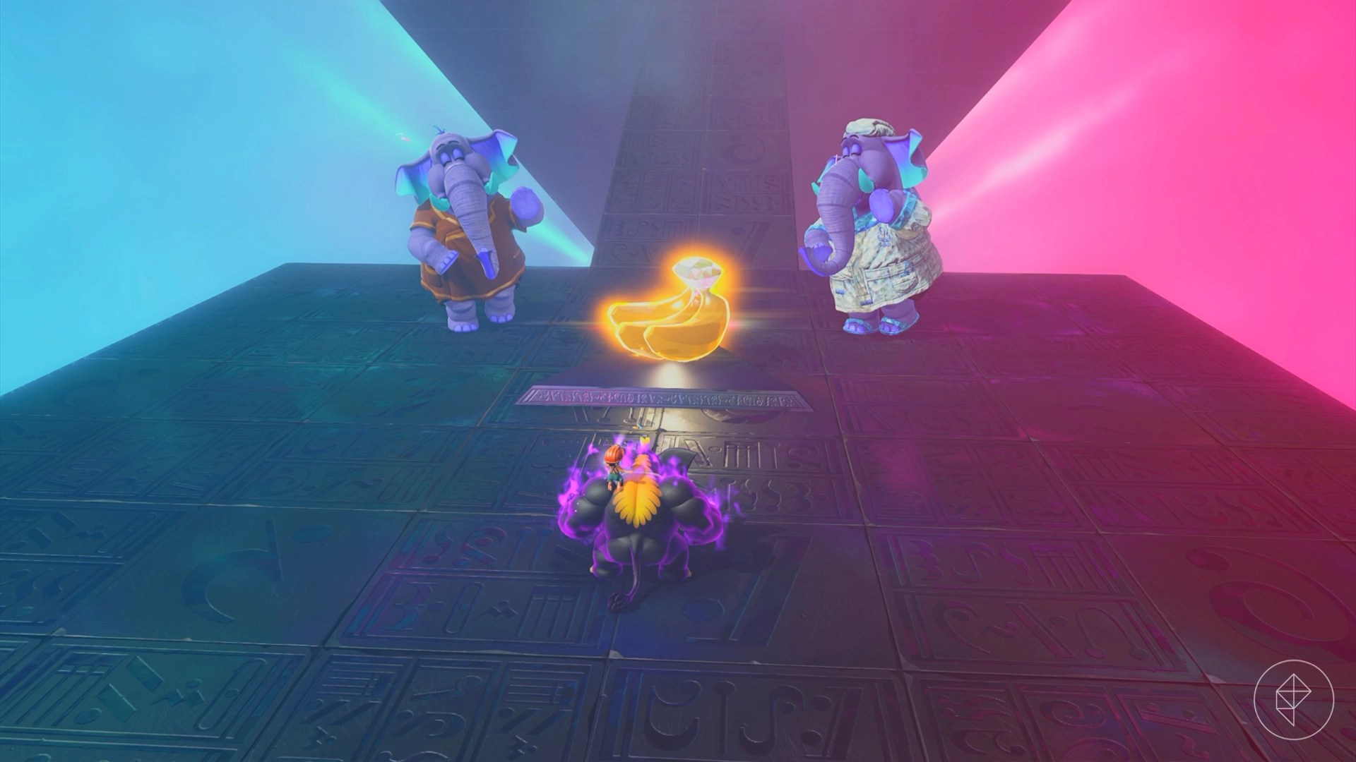 – Explore behind walls and tornadoes, climb shelves, and brave lava to uncover more gems. For instance, breaking a cracked wall behind the Elephant Elder reveals a hidden banana.