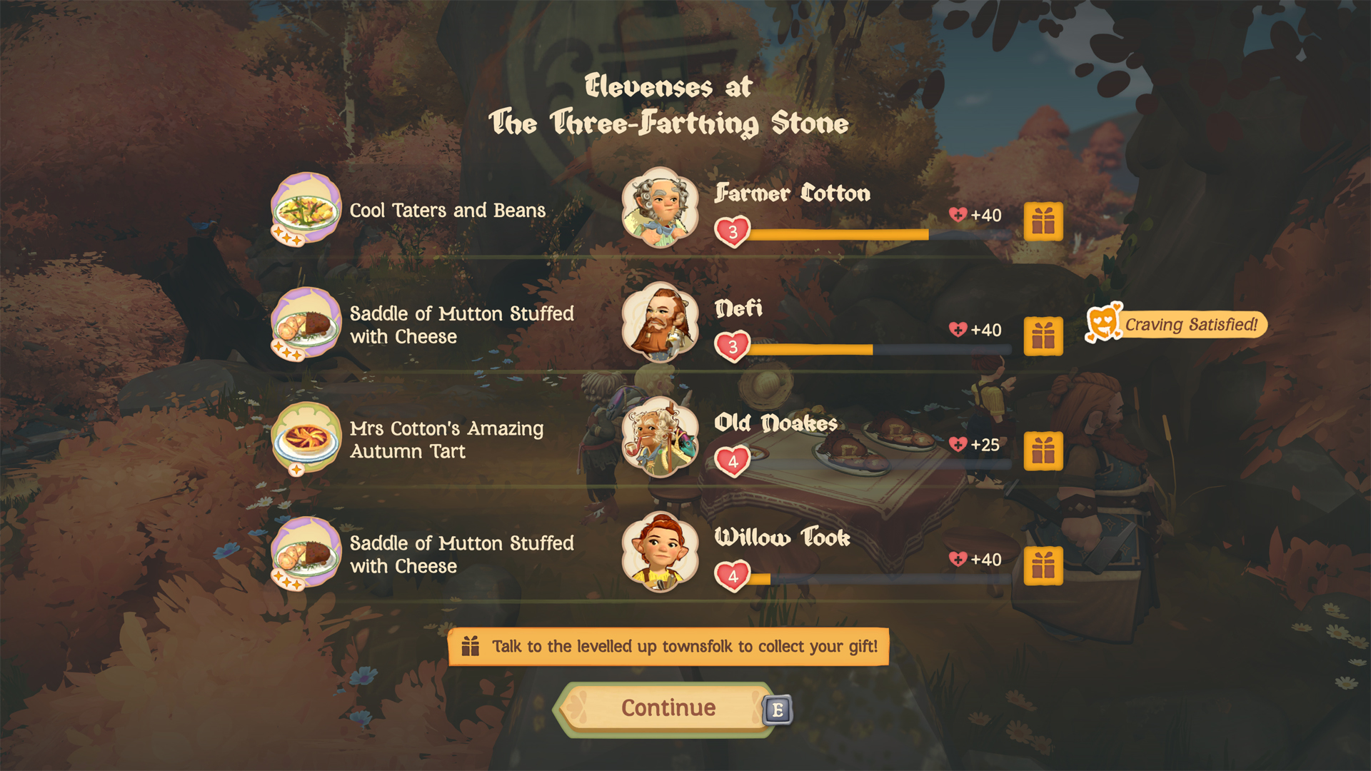 Friendship levels in Tales of the Shire range from 1 to 10 and can be tracked in the Townsfolk menu. The key to improving your bond? Food. But not just handing over a plate—Hobbits prefer a Shared Meal. To set this up, head to your writing desk inside your Hobbit-hole, select “plan a shared meal,” and pick a venue.