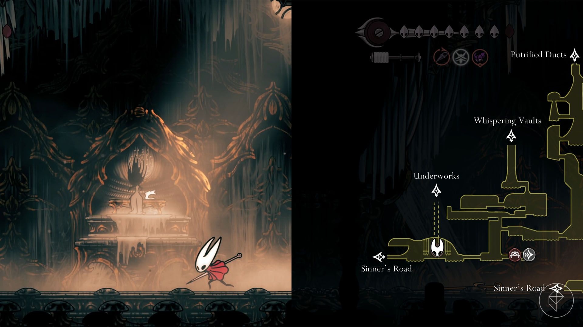 Location: West side of Wormways behind a Weaver-etched door. You need Needolin and Clawline to reach the statue on the left side of the room.