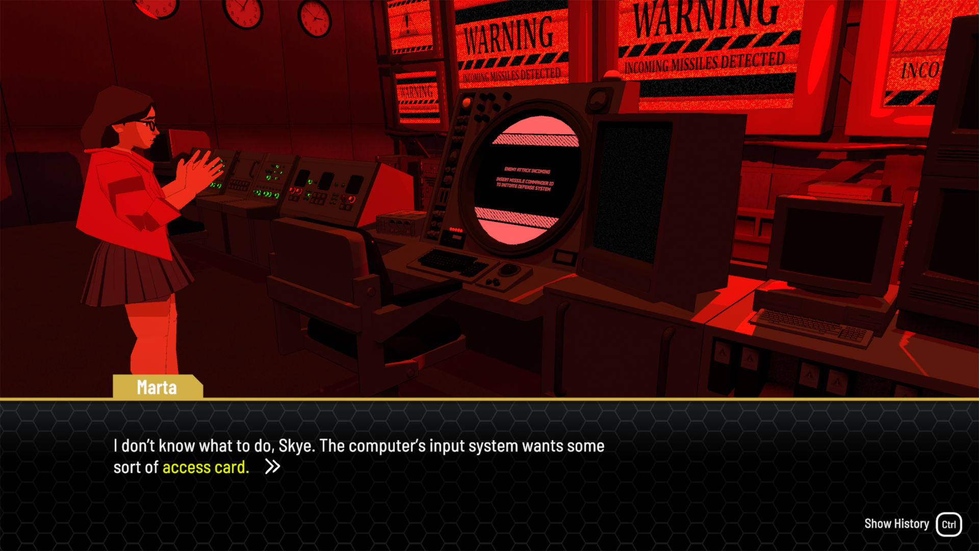 Once you’ve got the card, go interact with the computer next to Marta. This kicks off a Missile Command puzzle where you’ll need to destroy incoming missiles. Clearing this challenge opens the door to the next stage — a keypad puzzle in the Training Lounge.
