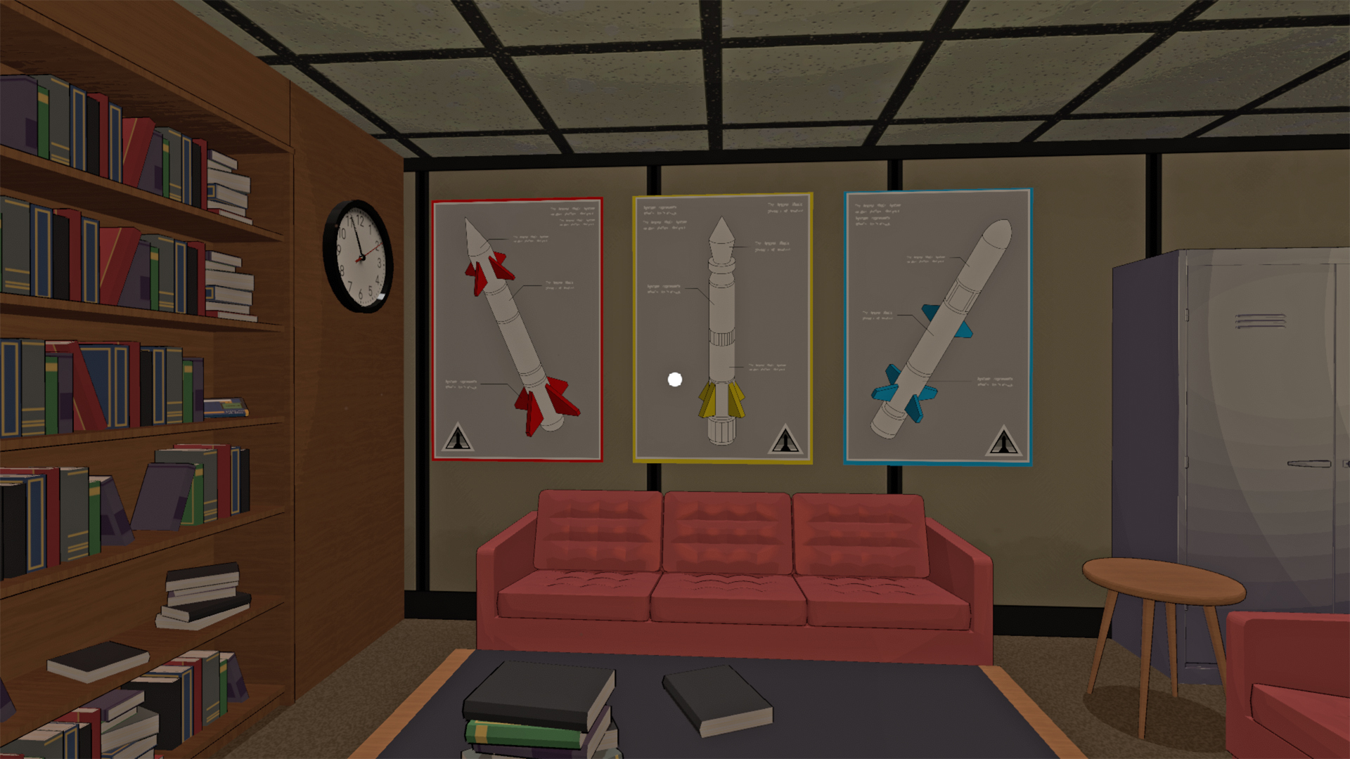 Now, turn around and check out the rocket posters on the wall behind you. They match those colors exactly — one in red, one in yellow, and one in blue.