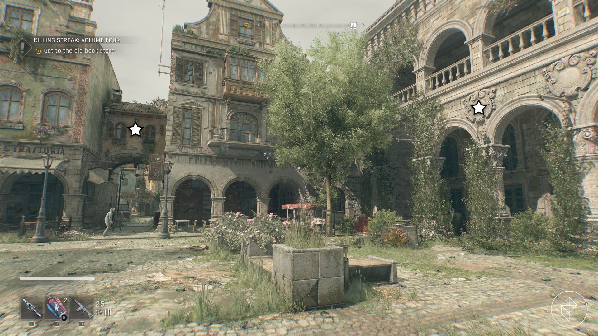 With the statue behind you, check the southwest corner wall and the small bridge house — each hides one of the last crests. Once those two are down, no beaver crests remain around the square.
